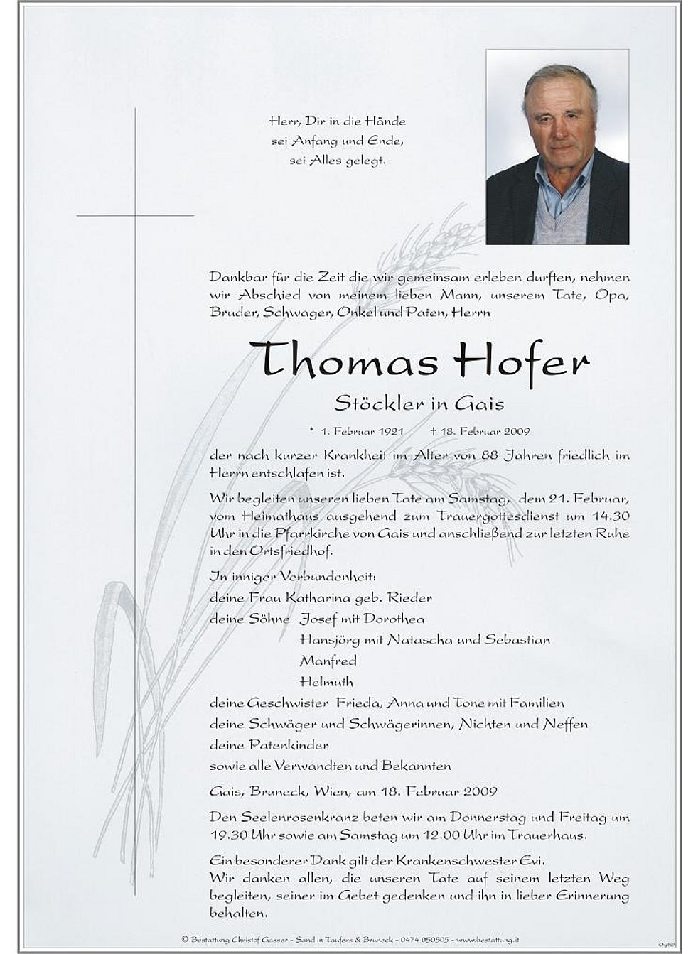 Wir begleiten unseren lieben Tate am Samstag, dem 21. Februar, vom Heimathaus ausgehend zum Trauergottesdienst um 14.30 Uhr in die Pfarrkirche von Gais und anschließend zur letzten Ruhe in den Ortsfriedhof.
