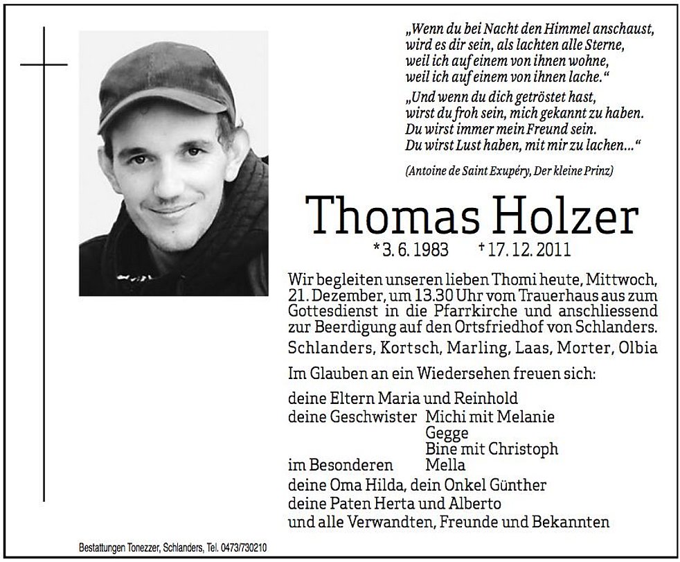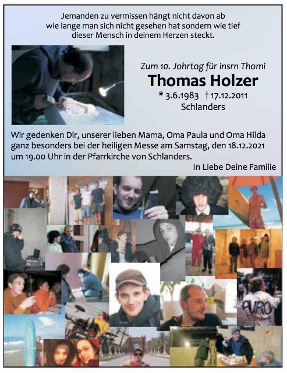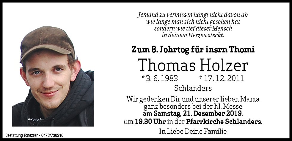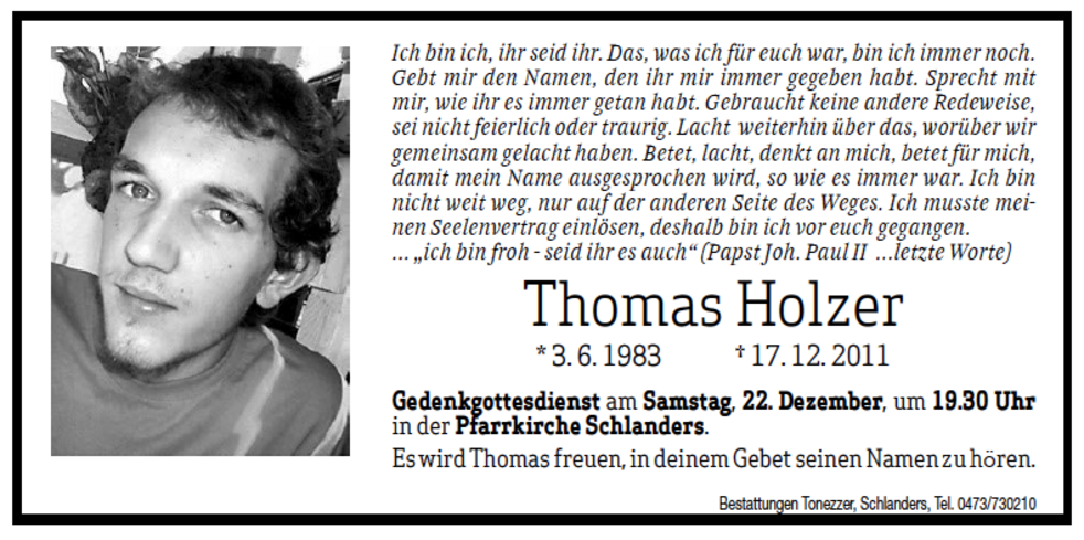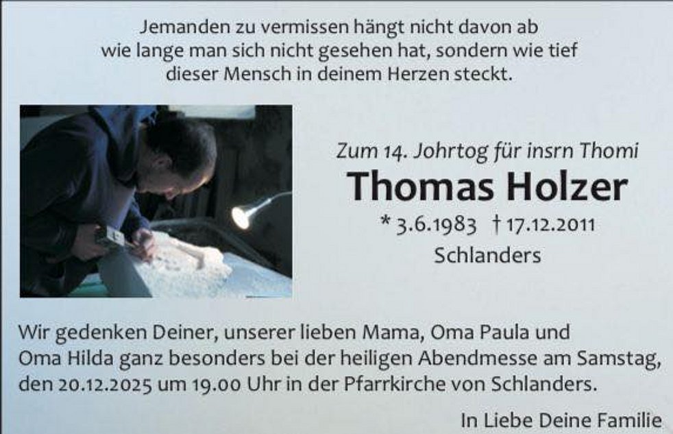 Wir begleiten unseren lieben Thomi am Mittwoch, 21. Dezember, um 13.30 Uhr vom Trauerhaus aus zum Gottesdienst in die Pfarrkirche und anschliessend zur Beerdigung auf den Ortsfriedhof von Schlanders.