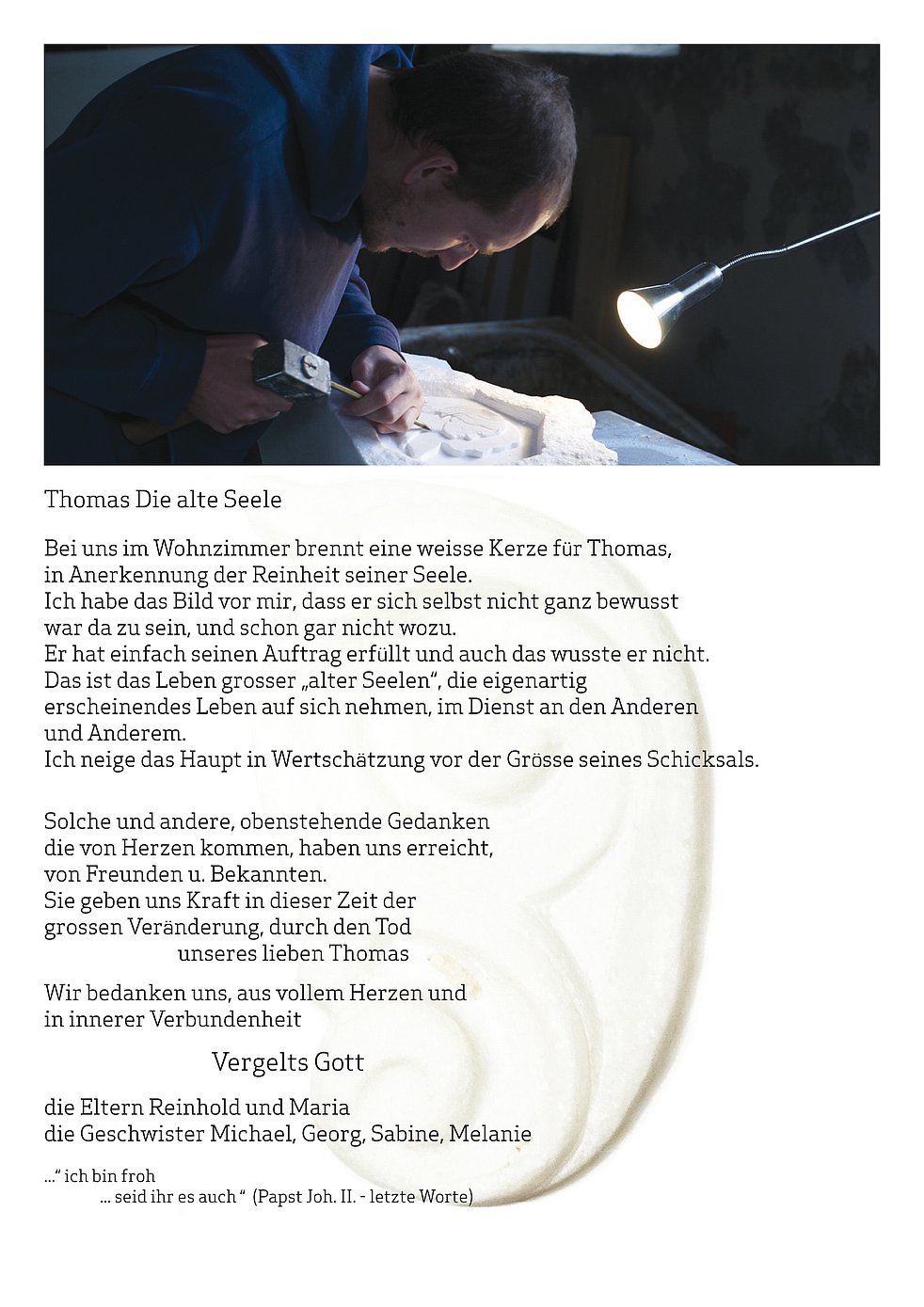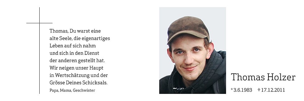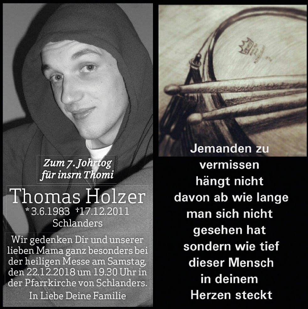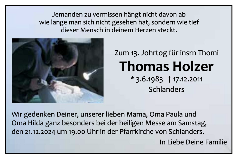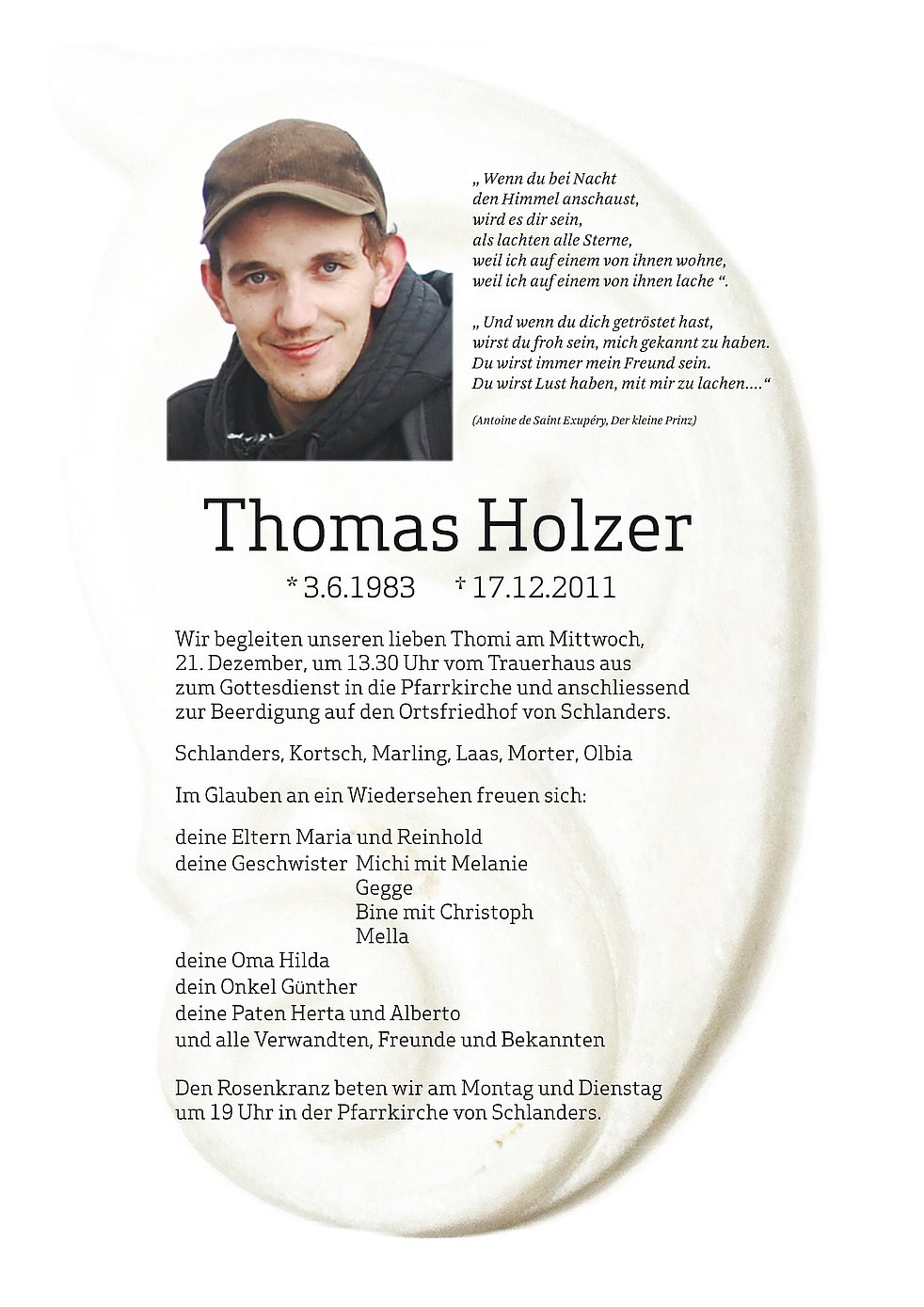 Wir begleiten unseren lieben Thomi am Mittwoch, 21. Dezember, um 13.30 Uhr vom Trauerhaus aus zum Gottesdienst in die Pfarrkirche und anschliessend zur Beerdigung auf den Ortsfriedhof von Schlanders.