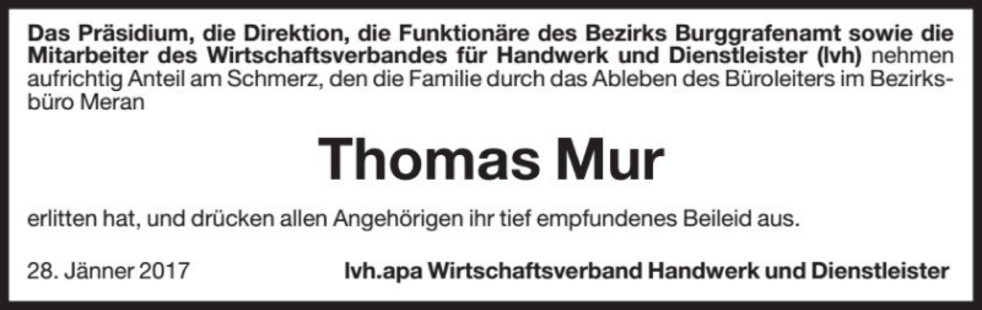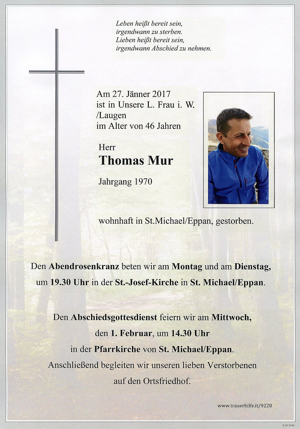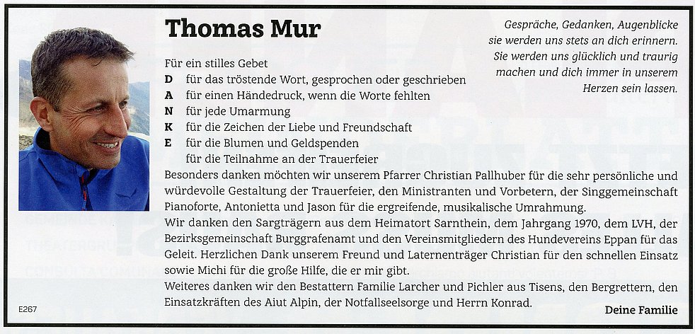 Den Trauergottesdienst feiern wir am Mittwoch, den 1.Februar um 14.30 Uhr in der Pfarrkirche von St. Michael/Eppan. Anschließend begleiten wir unseren lieben Thomas auf den Ortsfriedhof.