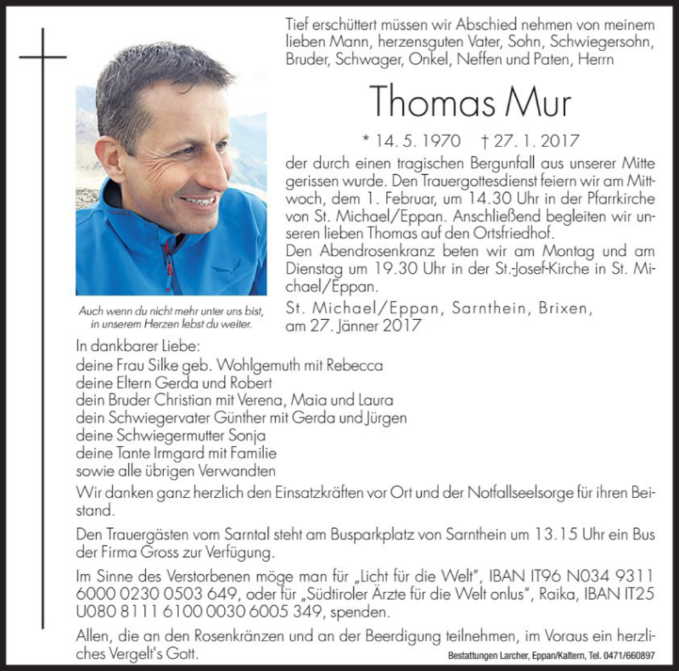 Im Sinne des Verstorbenen möge man für „Licht für die Welt“ IBAN IT96N0349311600002300503649 oder für „Südtiroler Ärzte für die Welt onlus“ Raika IBAN IT25U0808111610000306005349 spenden.