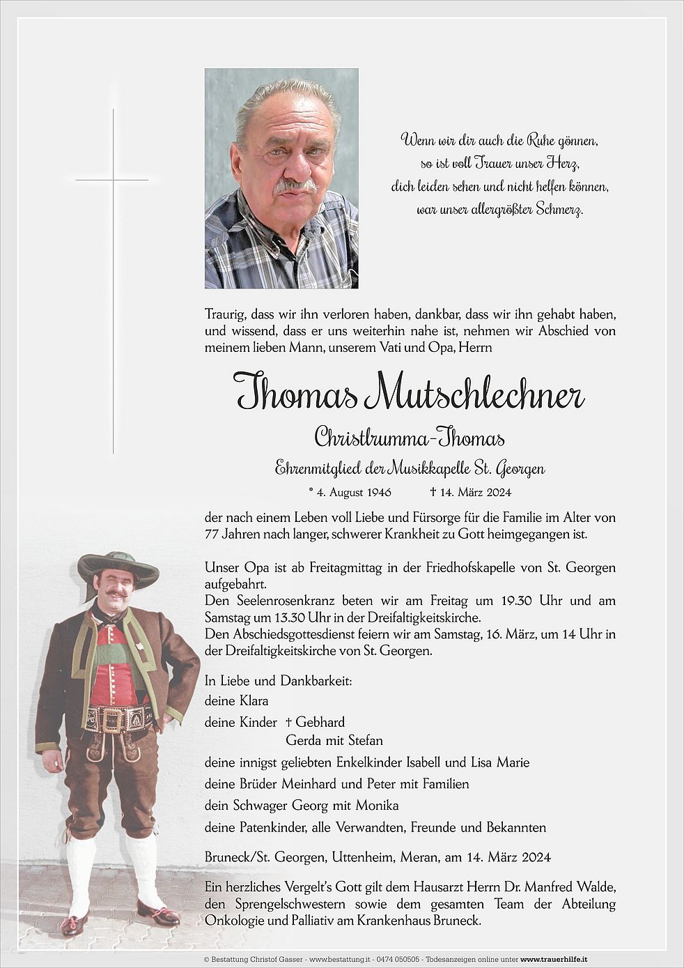 Unser Opa ist ab Freitagmittag in der Friedhofskapelle von St. Georgen aufgebahrt.