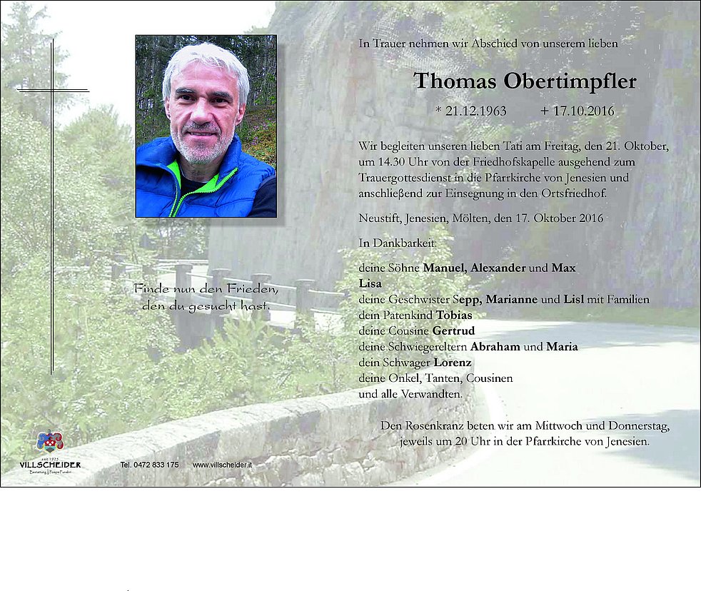 Wir begleiten unseren lieben Tati am Freitag, den 21. Oktober, um 14.30 Uhr von der Friedhofskapelle ausgehend zum Trauergottesdienst in die Pfarrkirche von Jenesien und anschlieβend zur Einsegnung in den Ortsfriedhof.