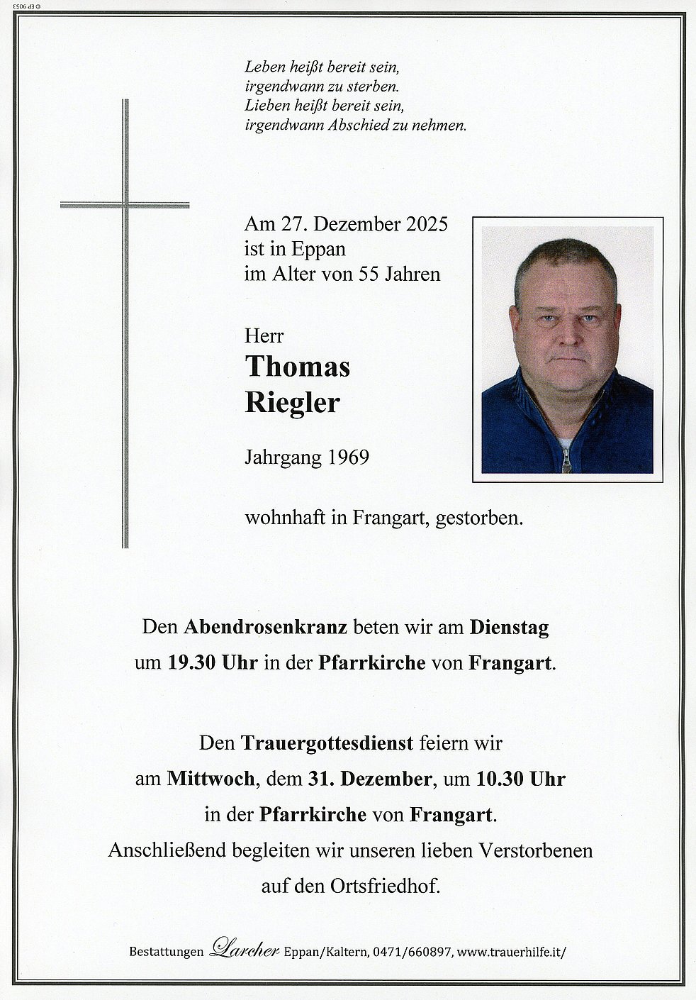 Den Trauergottesdienst feiern wir am Mittwoch, dem 31. Dezember um 10.30 Uhr in der Pfarrkirche von Frangart, anschließend begleiten wir unseren lieben Thomas auf den Ortsfriedhof.