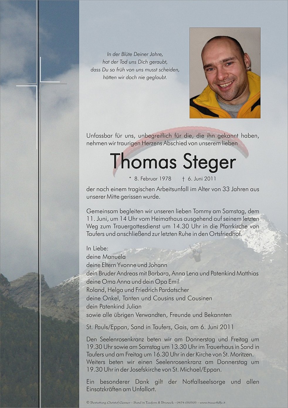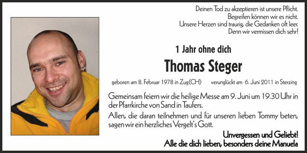 Gemeinsam begleiten wir unseren lieben Tommy am Samstag, dem 11. Juni, um 14 Uhr vom Heimathaus ausgehend auf seinem letzten Weg zum Trauergottesdienst um 14.30 Uhr in die Pfarrkirche von Taufers und anschließend zur letzten Ruhe in den Ortsfriedhof.