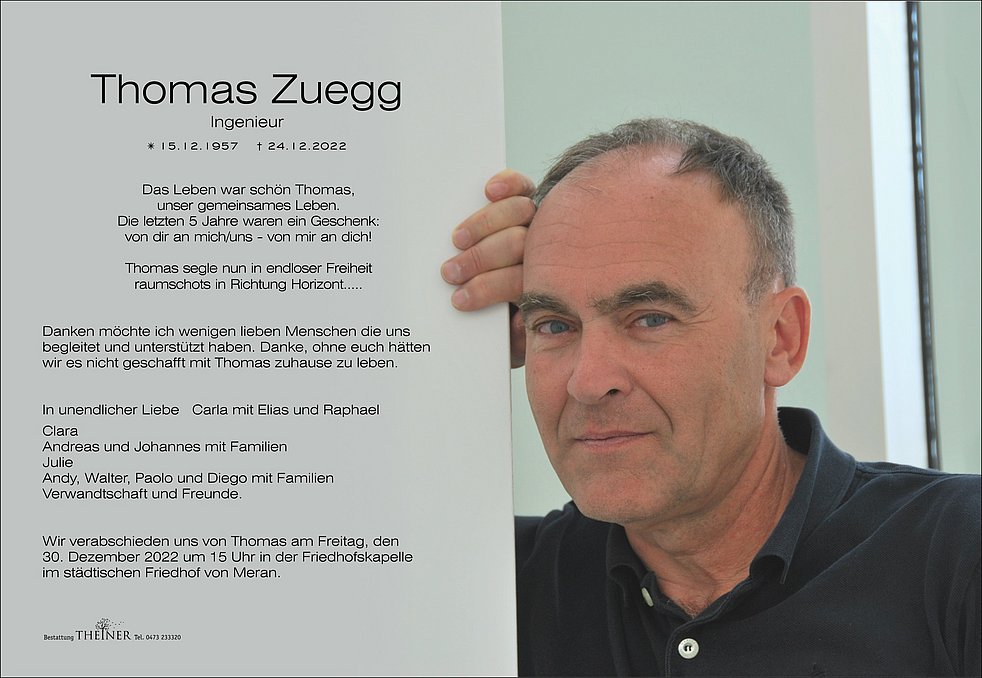 Wir verabschieden uns von Thomas am Freitag, den 30. Dezember 2022 um 15 Uhr in der Friedhofskapelle im städtischen Friedhof von Meran.