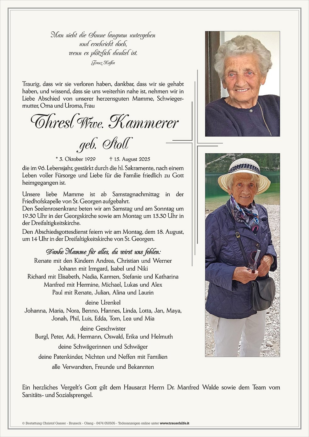 die im 96. Lebensjahr, gestärkt durch die hl. Sakramente, nach einem Leben voller Fürsorge und Liebe für die Familie friedlich zu Gott heimgegangen ist.