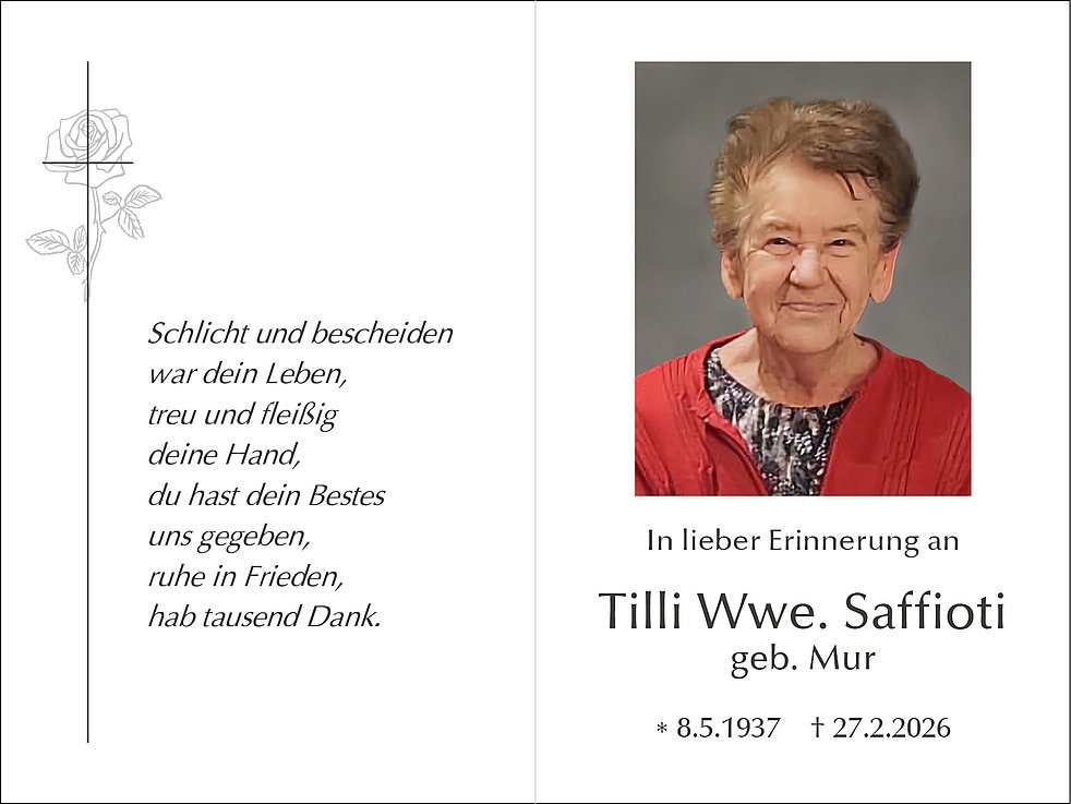 Den Trauergottesdienst mit anschließender Einsegnung feiern wir am Montag, den 2. März, um 14.30 Uhr in der Pfarrkirche von Rentsch.
