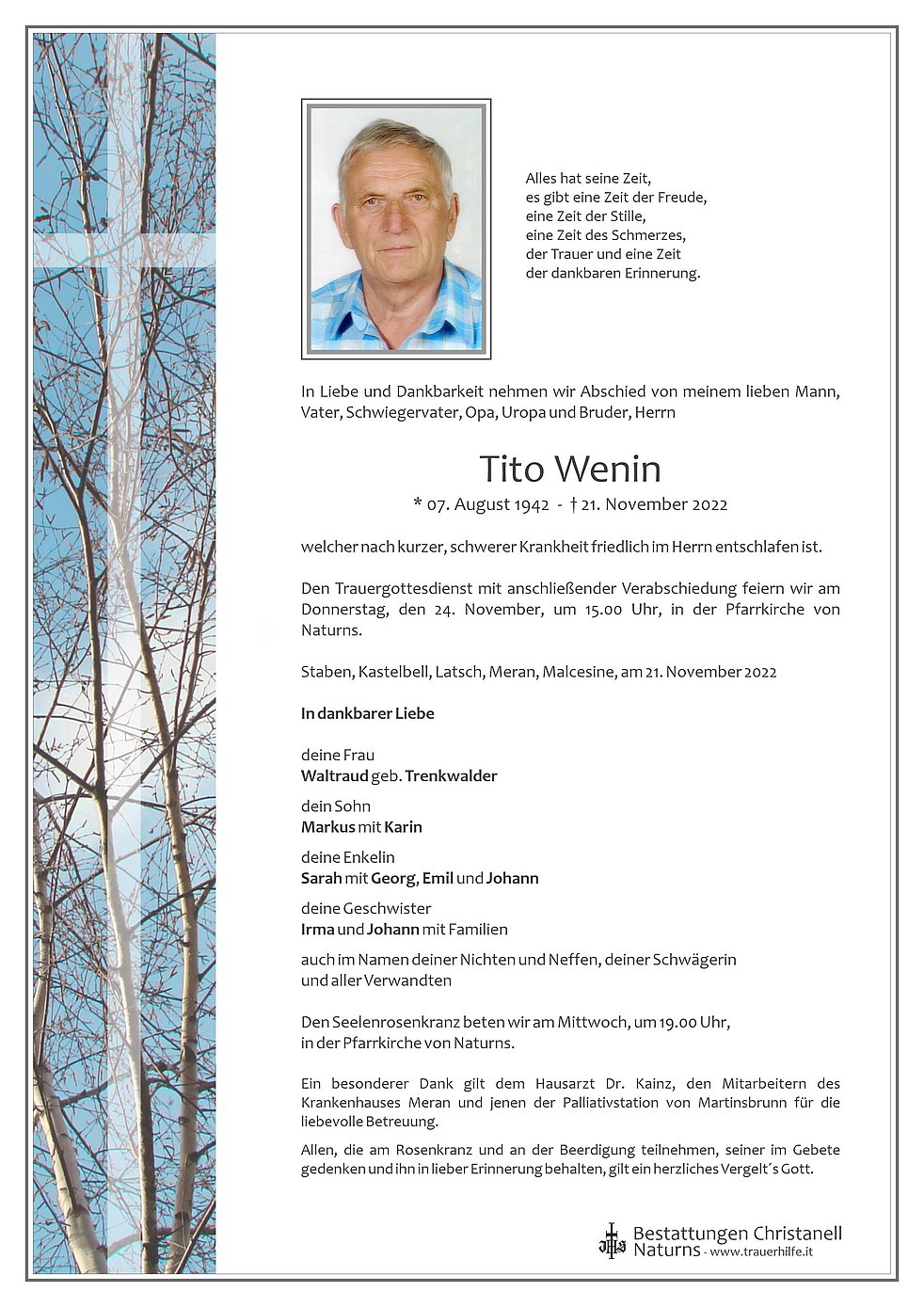 Den Trauergottesdienst mit anschließender Verabschiedung feiern wir am Donnerstag, den 24. November, um 15.00 Uhr, in der Pfarrkirche von Naturns.
