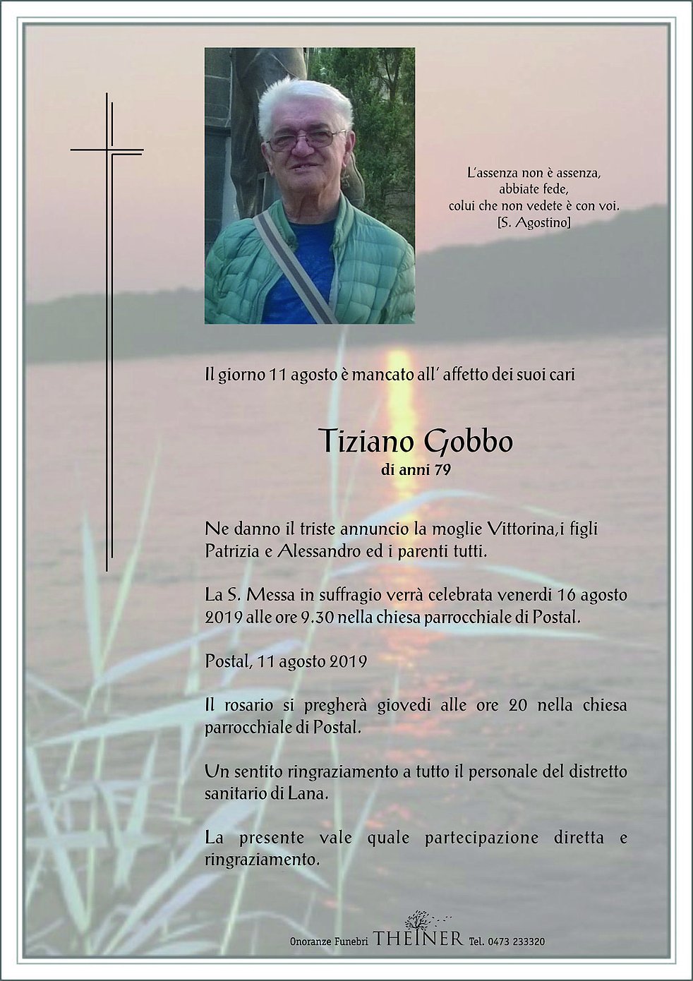 La S. Messa in suffragio verrà celebrata venerdi 16 agosto 2019 alle ore 9.30 nella chiesa parrocchiale di Postal.