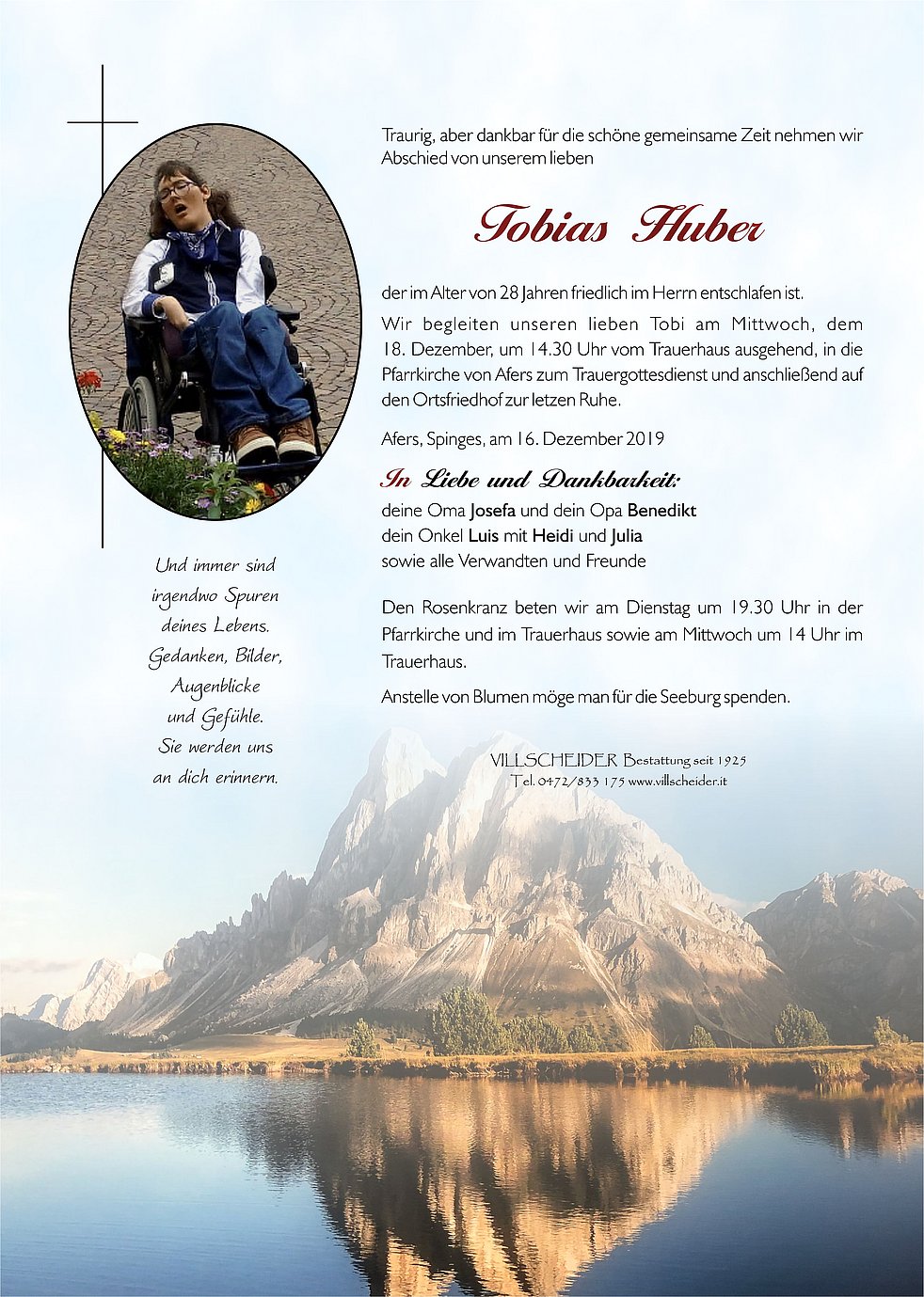 Mein Beileid Luis, Benedikt und Seffe. Is Lebm isch oft ungerecht ober iatz isch da Tobias wieder bei seiner Mami wo es ihm guat geat. I wünsch enk viel Kroft für di nägste Zeit und möge da Herrgott enk fir des belohn wos des de gonzn Johr firn Tobi gitun hob.