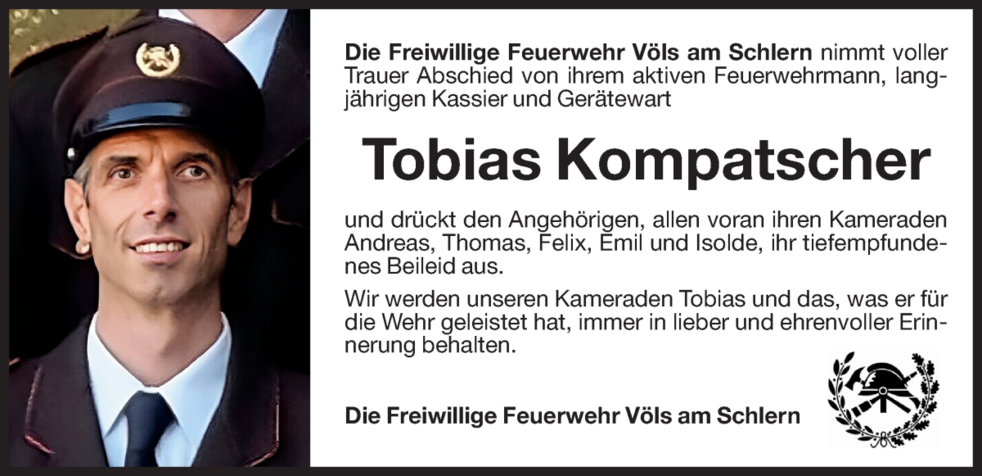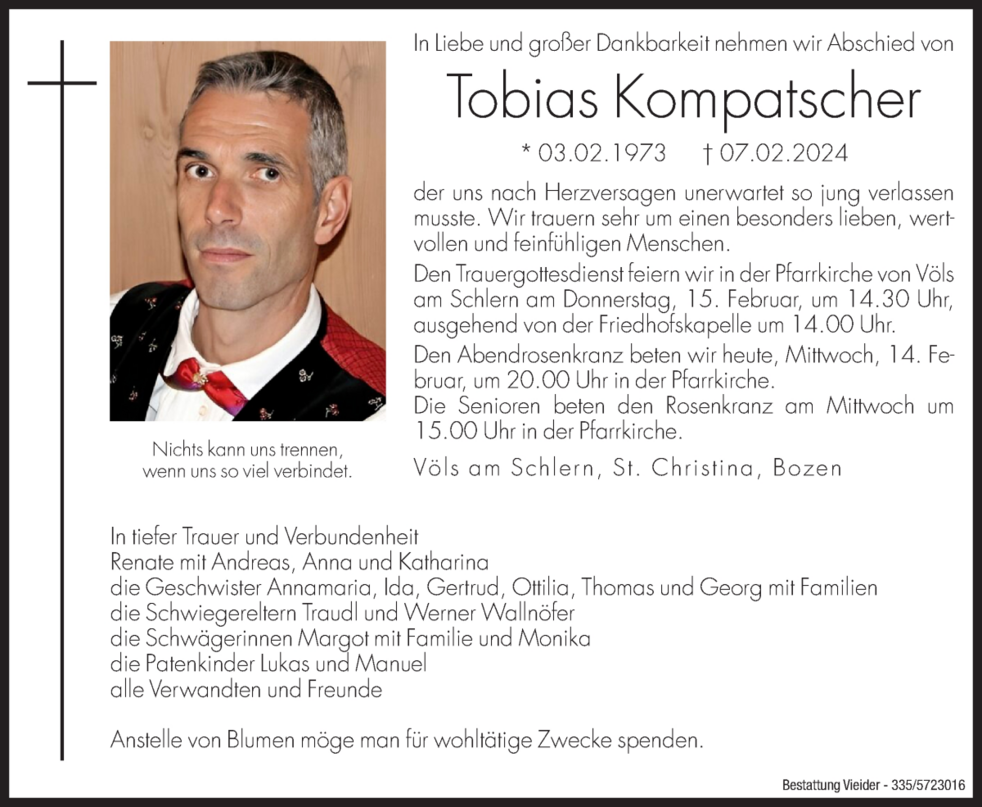 Den Trauergottesdienst feiern wir in der Pfarrkirche von Völs am Schlern am Donnerstag, 15. Februar um 14.30 Uhr, ausgehend von der Friedhofskapelle um 14.00 Uhr.