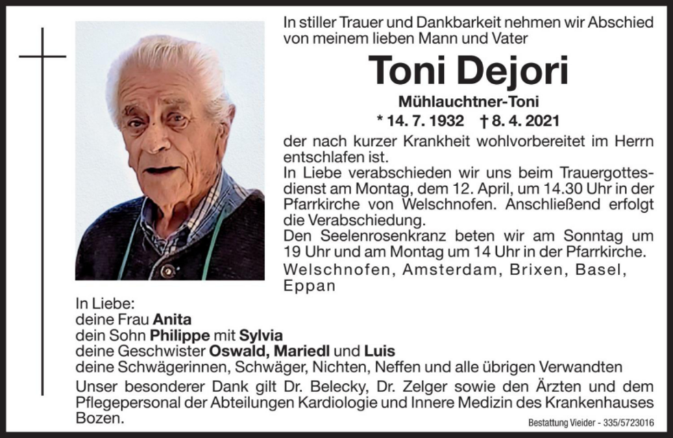 In Liebe verabschieden wir uns beim Trauergottesdienst am Montag, dem 12. April um 14.30 Uhr in der Pfarrkirche von Welschnofen. Anschließend erfolgt die Verabschiedung.