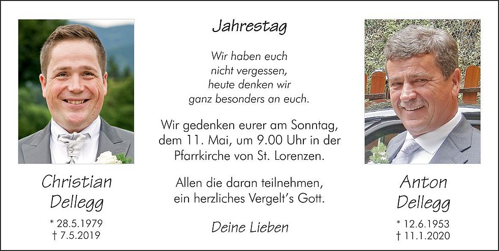 Wir begleiten unseren lieben Toni am Dienstag, dem 14. Jänner, von der Friedhofskapelle ausgehend, auf seinem letzten Weg zum Trauergottesdienst um 14.30 Uhr in die Pfarrkirche von St. Lorenzen und anschließend zur letzten Ruhe in den Friedhof.