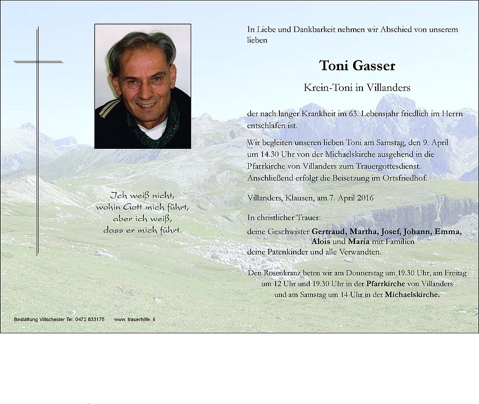 um 14.30 Uhr von der Michaelskirche ausgehend in die Pfarrkirche von Villanders zum Trauergottesdienst. Anschließend erfolgt die Beisetzung im Ortsfriedhof.