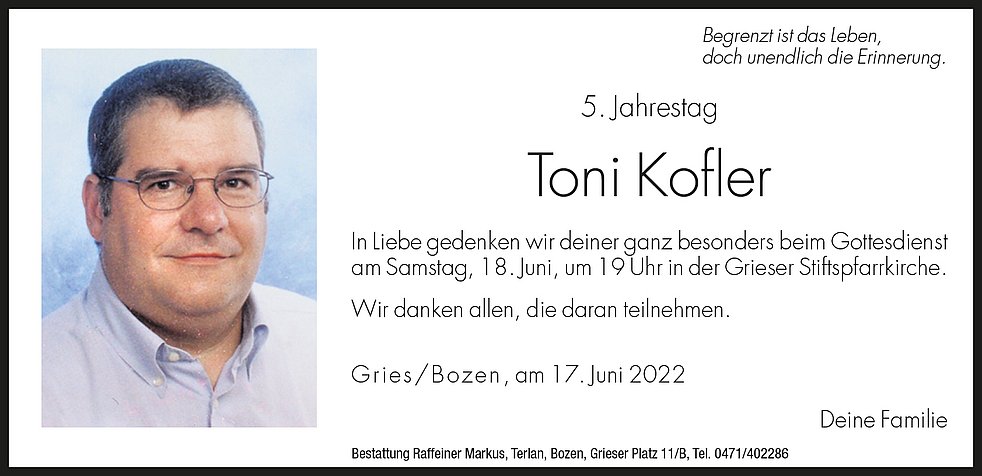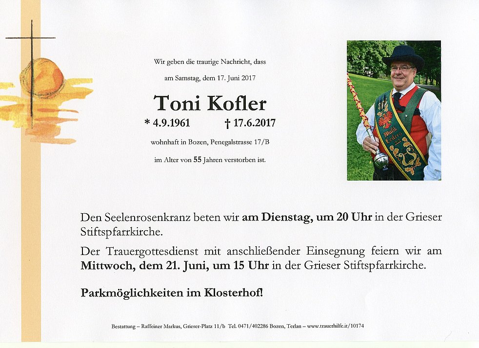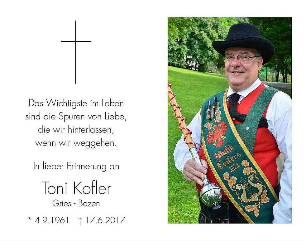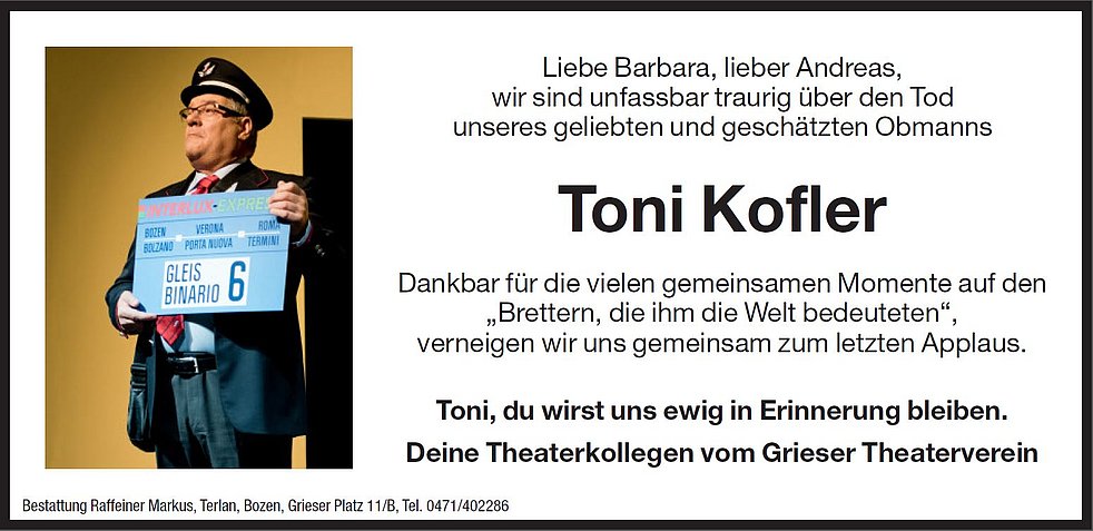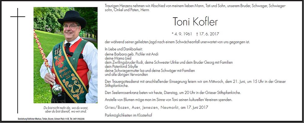 Anstelle von Blumen, möge man im Sinne von Toni seinen kulturellen Vereinen spenden.