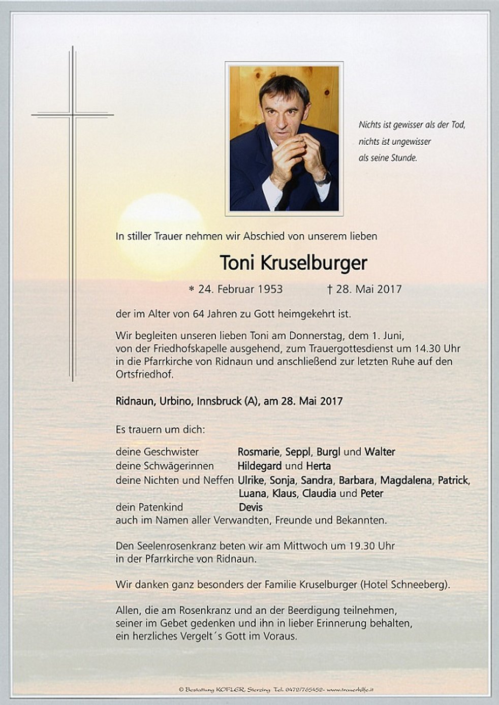 Wir begleiten unseren lieben Toni am Donnerstag, dem 1. Juni, von der Friedhofskapelle ausgehend, zum Trauergottesdienst um 14.30 Uhr in die Pfarrkirche von Ridnaun und anschließend zur letzten Ruhe auf den Ortsfriedhof.
