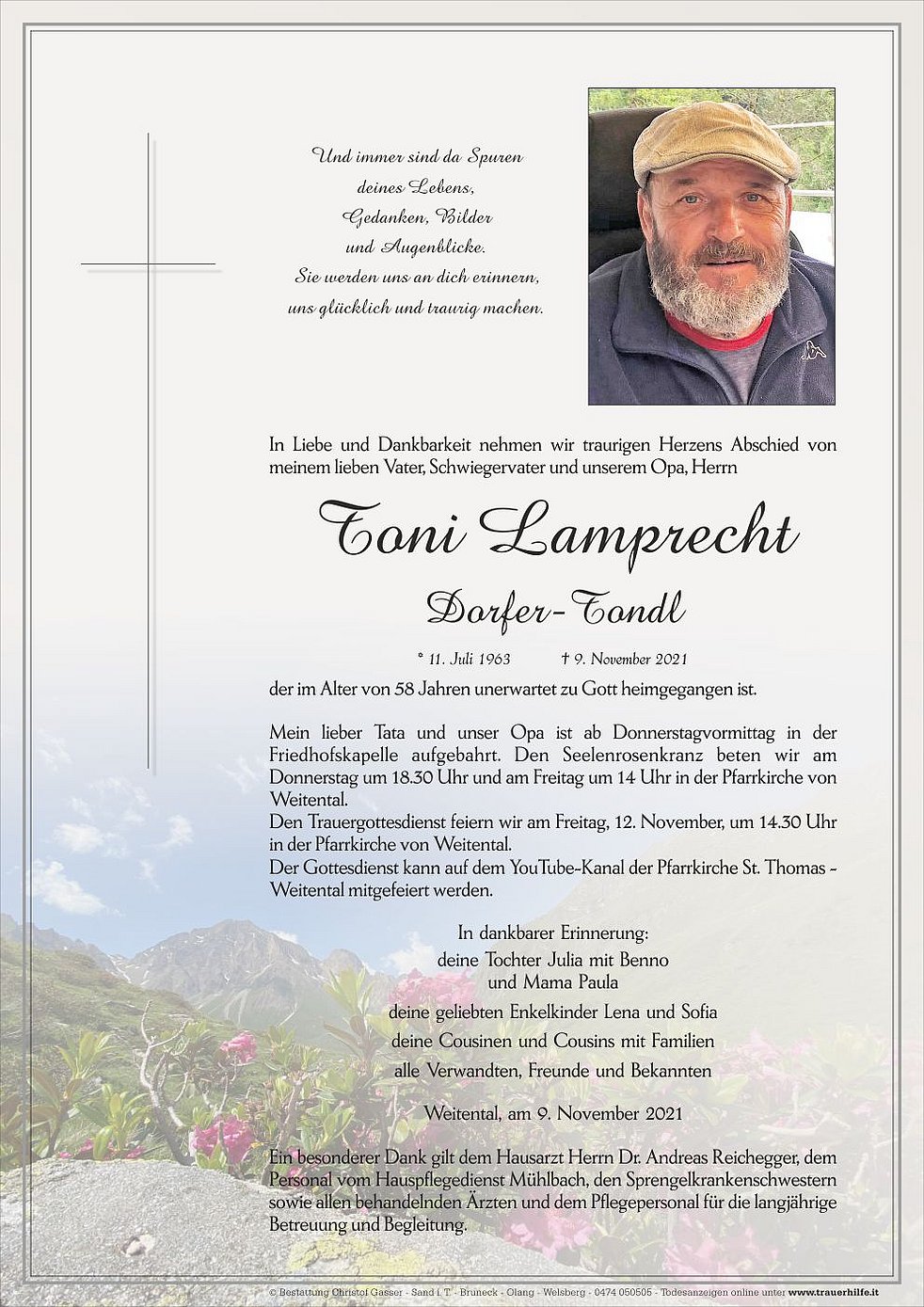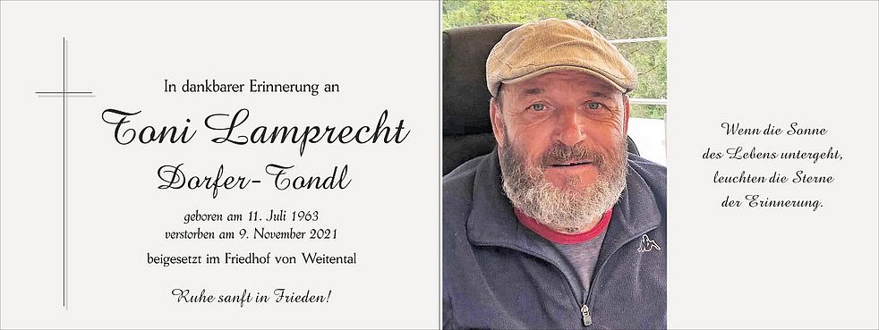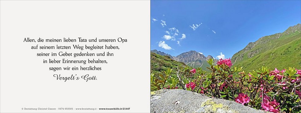 Ein besonderer Dank gilt dem Hausarzt Herrn Dr. Andreas Reichegger, dem Personal vom Hauspflegedienst Mühlbach, den Sprengelkrankenschwestern sowie allen behandelnden Ärzten und dem Pflegepersonal für die langjährige Betreuung und Begleitung.