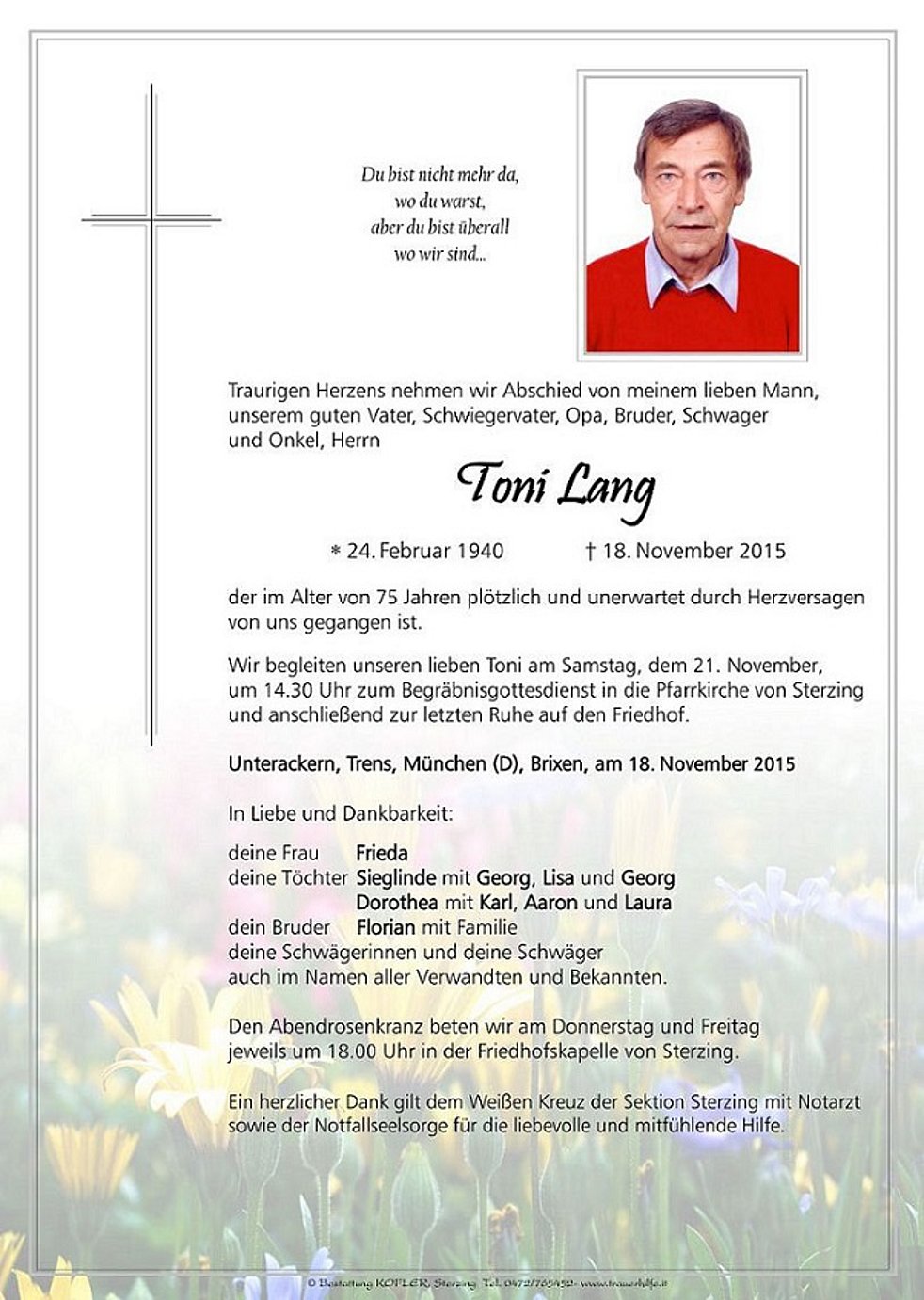 um 14.30 Uhr zum Begräbnisgottesdienst in die Pfarrkirche von Sterzing