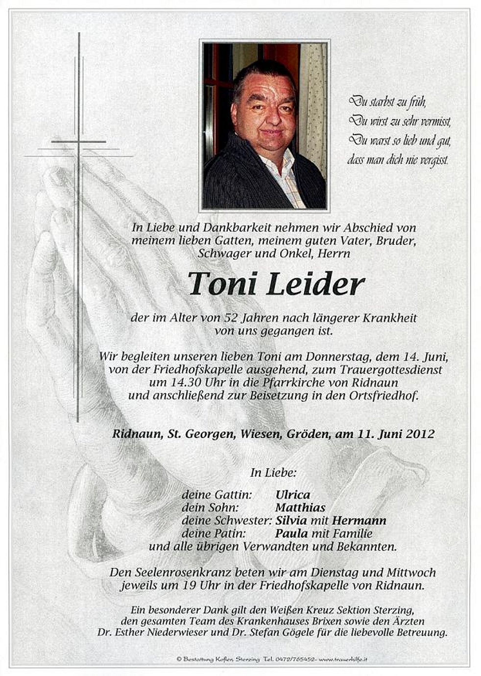 Wir begleiten unseren lieben Toni am Donnerstag, dem 14. Juni, von der Friedhofskapelle ausgehend, zum Trauergottesdienst um 14.30 Uhr in die Pfarrkirche von Ridnaun