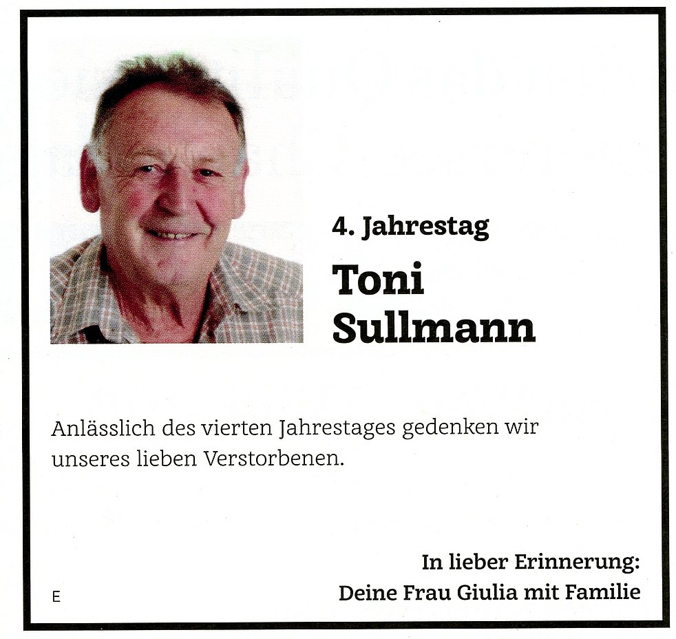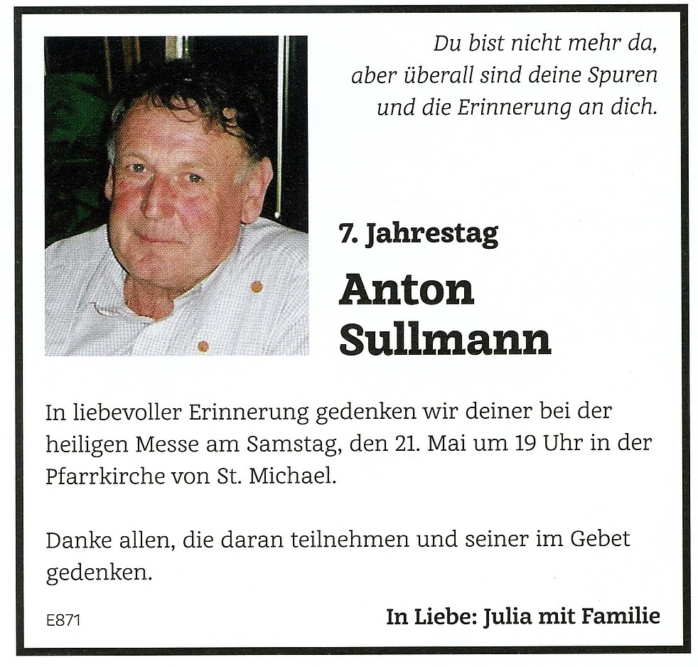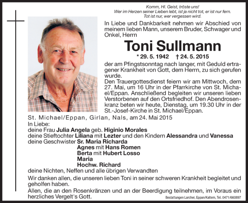 der am Pfingstsonntag nach langer mit Geduld ertragener Krankheit von Gott, dem Herrn, zu sich gerufen wurde. Den Trauergottesdienst feiern wir am Mittwoch, dem 27. Mai, um 16 Uhr in der Pfarrkirche von St. Michael/Eppan. Anschließend begleiten wir unseren lieben Verstorbenen auf den Ortsfriedhof.
