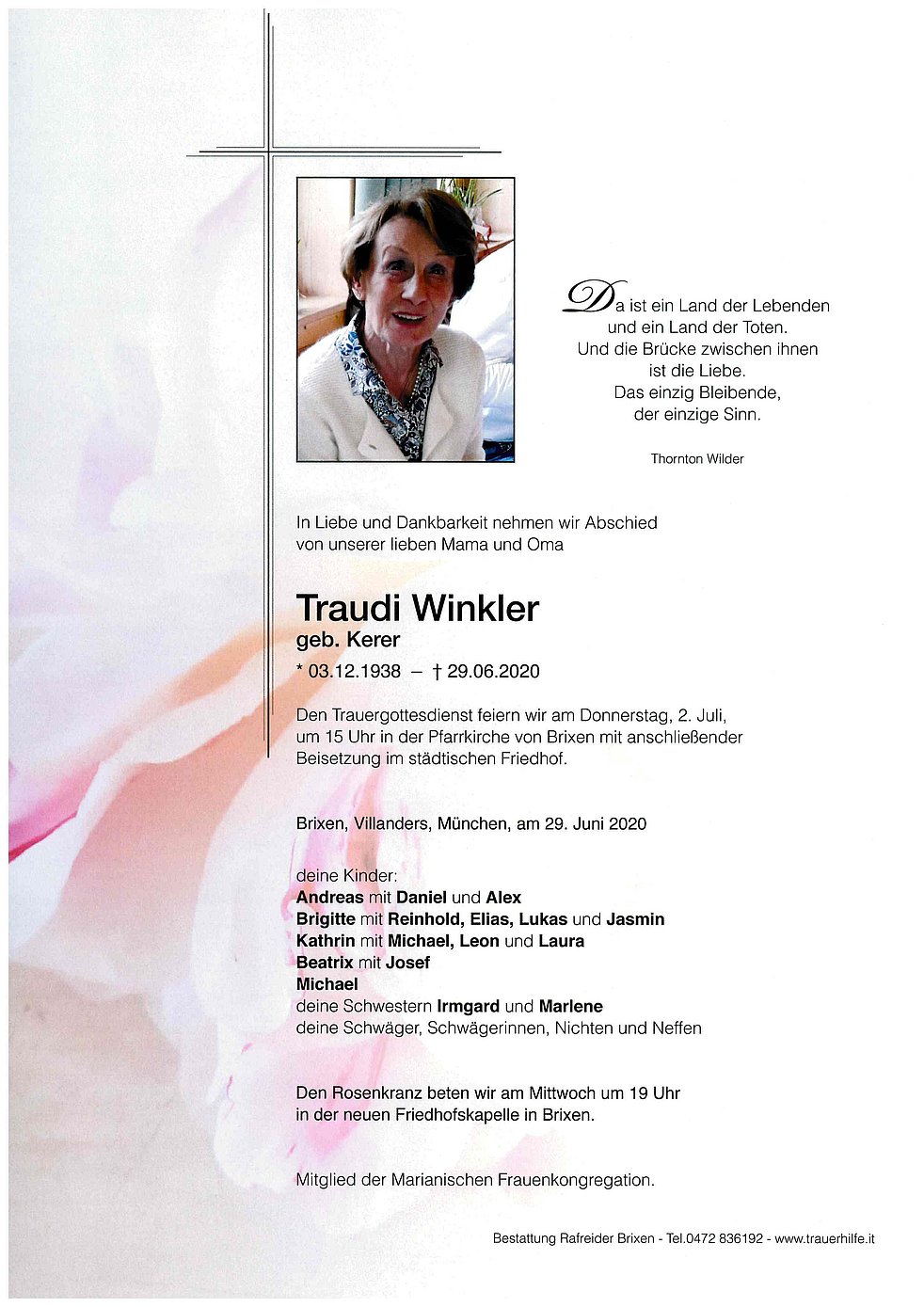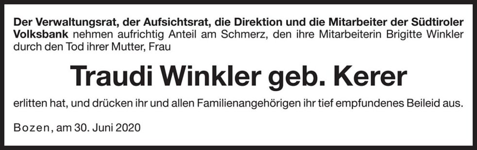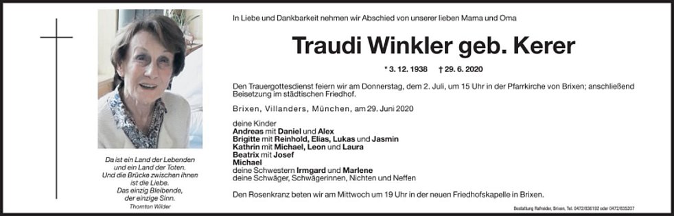 Den Trauergottesdienst feiern wir am Donnerstag, 2. Juli, um 15 Uhr in der Pfarrkirche von Brixen mit anschließender Beisetzung im städtischen Friedhof.