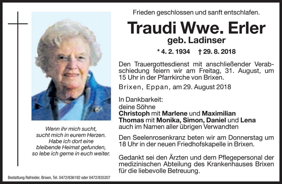 Den Trauergottesdienst mit anschließender Verabschiedung feiern wir am Freitag, 31. August, um 15 Uhr in der Pfarrkirche von Brixen.