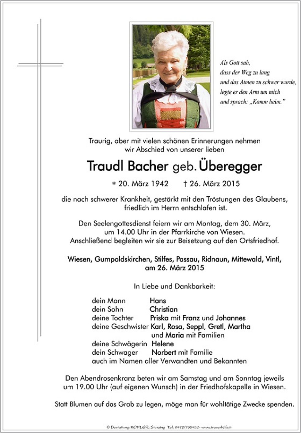um 19.00 Uhr (auf eigenen Wunsch) in der Friedhofskapelle in Wiesen.