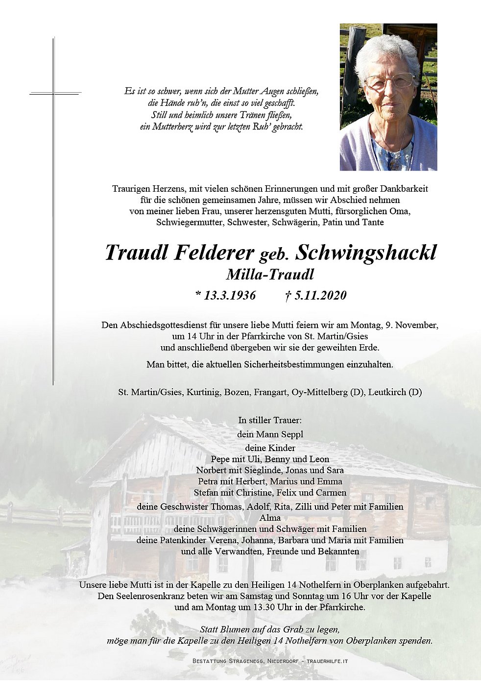 Den Abschiedsgottesdienst für unsere liebe Mutti feiern wir am Montag, 9. November, um 14 Uhr in der Pfarrkirche von St. Martin/Gsies und anschließend übergeben wir sie der geweihten Erde.