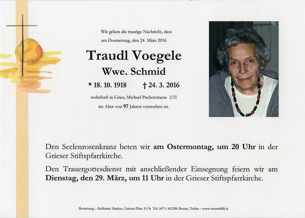 Den Trauergottesdienst mit anschlieβender Einsegnung feiern wir am Dienstag, den 29. März, um 11 Uhr in der Grieser Stiftspfarrkirche.
