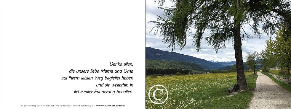 Ein besonderer Dank gilt ihrer Pflegerin Nadiya für die fürsorgliche Betreuung, dem Hausarzt Dr. Manfred Walde, den Sprengelschwestern, allen vom Hauspflegedienst sowie den Ärzten und dem Pflegepersonal der Abteilung Medizin A am Krankenhaus Bruneck.
