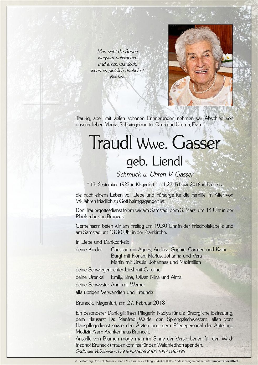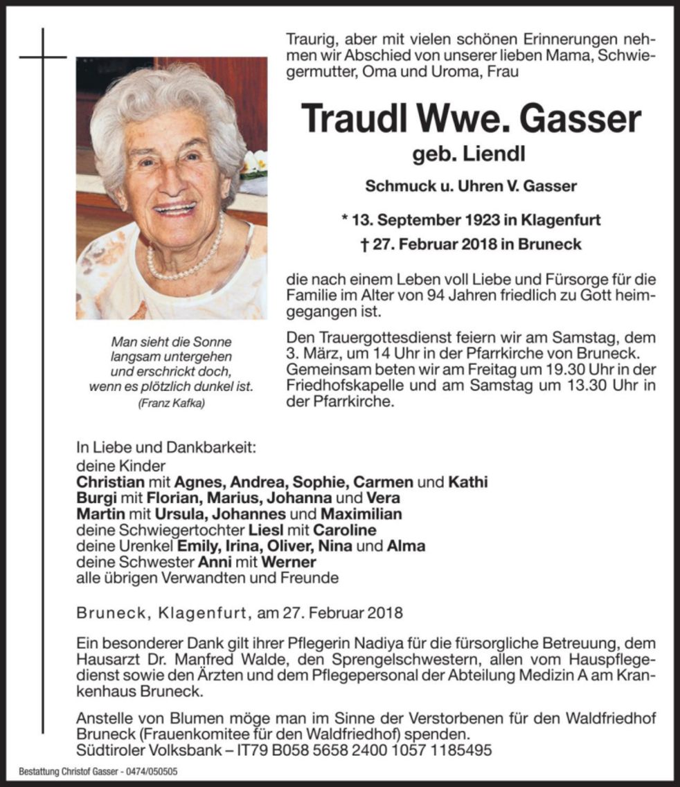 Anstelle von Blumen möge man im Sinne der Verstorbenen für den Waldfriedhof Bruneck (Frauenkomitee für den Waldfriedhof) spenden.