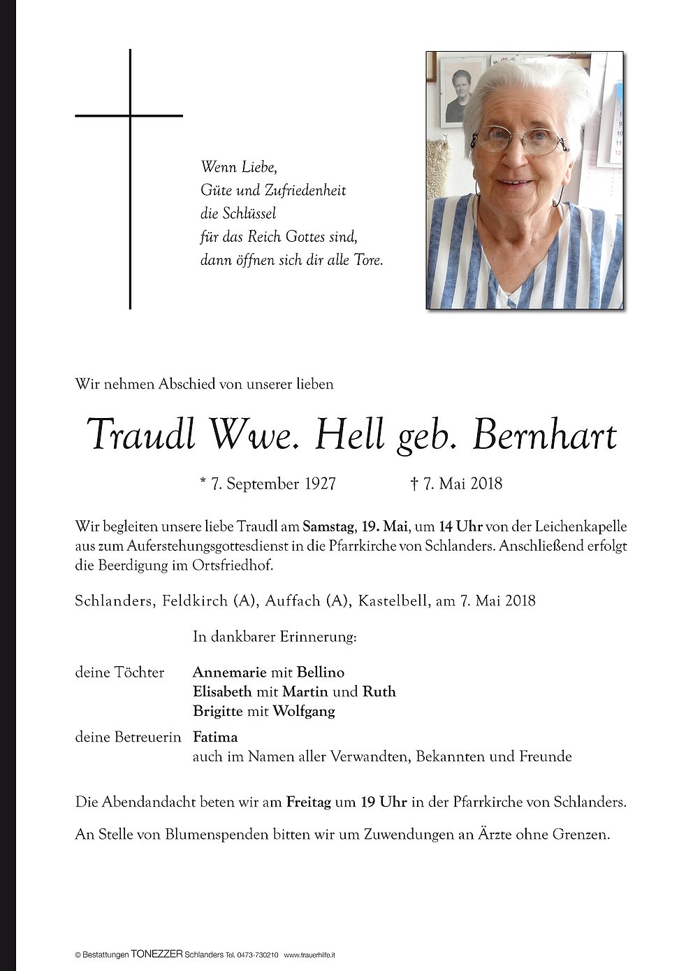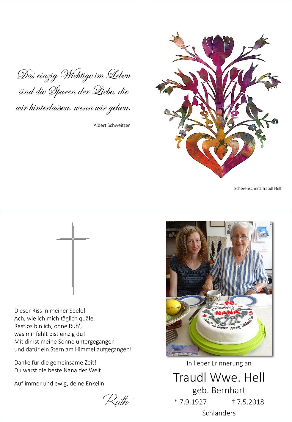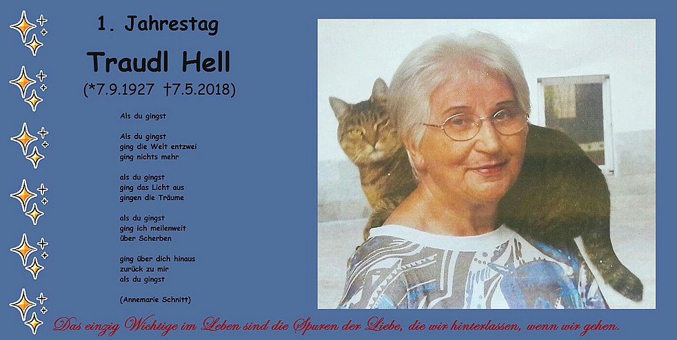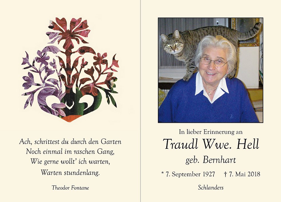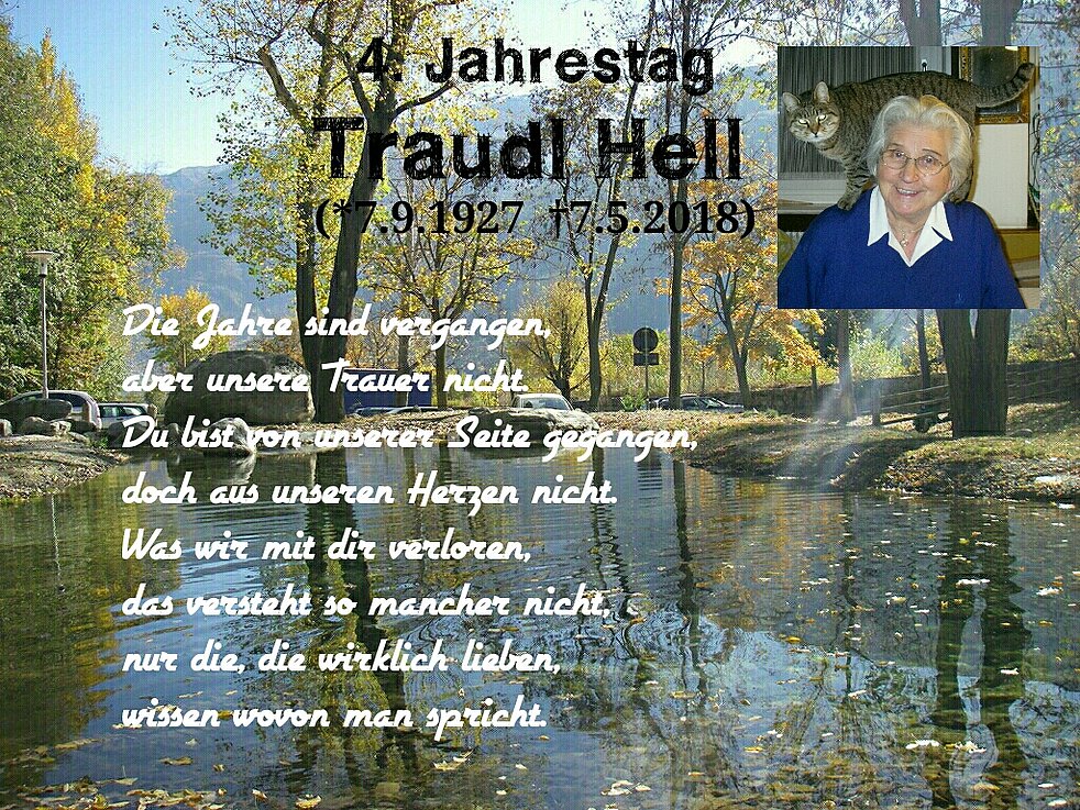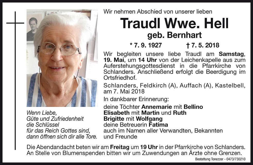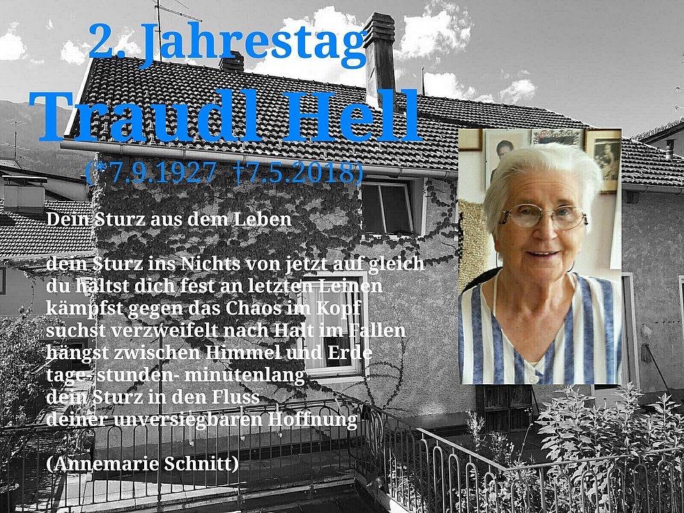 Wir begleiten unsere liebe Traudl am Samstag, 19. Mai, um 14 Uhr von der Leichenkapelle aus zum Auferstehungsgottesdienst in die Pfarrkirche von Schlanders.