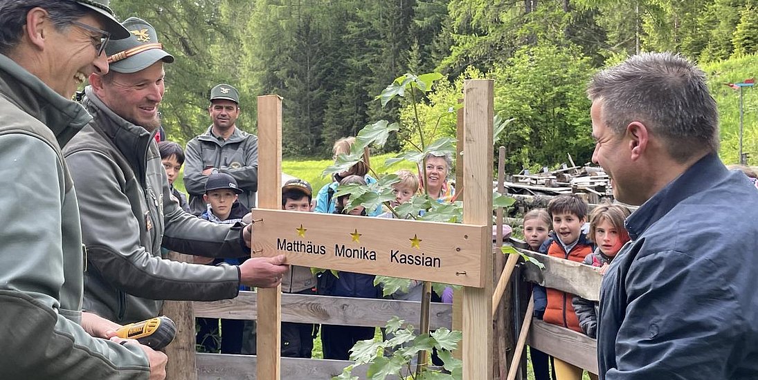 Der Ehemann und Vater Christian Tschurtschenthaler, der Bürgermeister Summerer dankten den Schülern, den Forstbeamten und dem Ideator Stefan Amhof für diese Initiative.