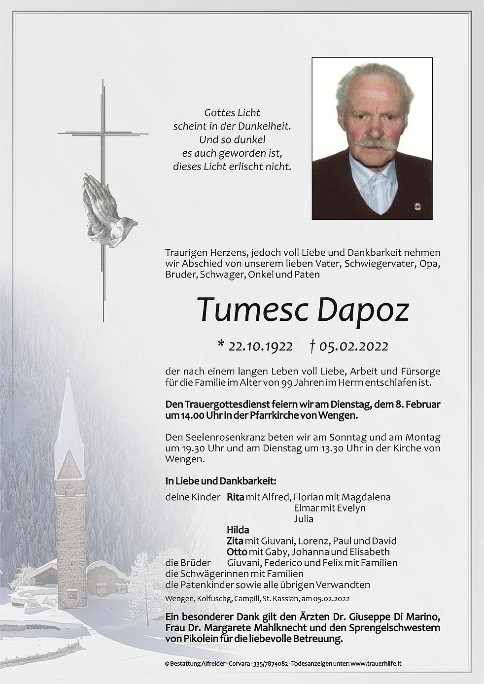 Den Trauergottesdienst feiern wir am Dienstag, dem 8. Februar um 14.00 Uhr in der Pfarrkirche von Wengen.