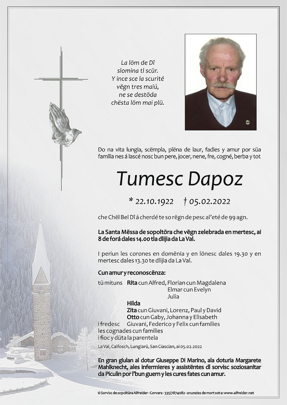 Ein besonderer Dank gilt den Ärzten Dr. Giuseppe Di Marino, Frau Dr. Margarete Mahlknecht und den Sprengelschwestern von Pikolein für die liebevolle Betreuung.