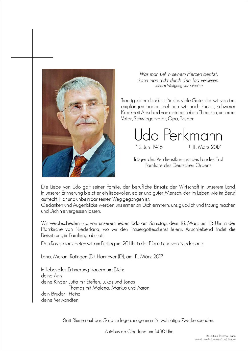 Wir verabschieden uns von unserem lieben Udo am Samstag, dem 18. März um 15 Uhr in der Pfarrkirche von Niederlana, wo wir den Trauergottesdienst feiern. Anschließend findet die Beisetzung im Familiengrab statt.