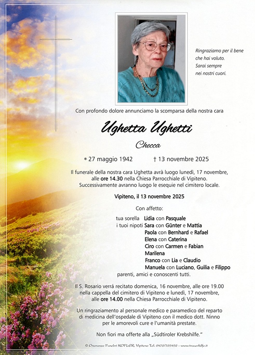 Il funerale della nostra cara Ughetta avrà luogo lunedì, 17 novembre, alle ore 14.30 nella Chiesa Parrocchiale di Vipiteno. Successivamente avranno luogo le esequie nel cimitero locale.
