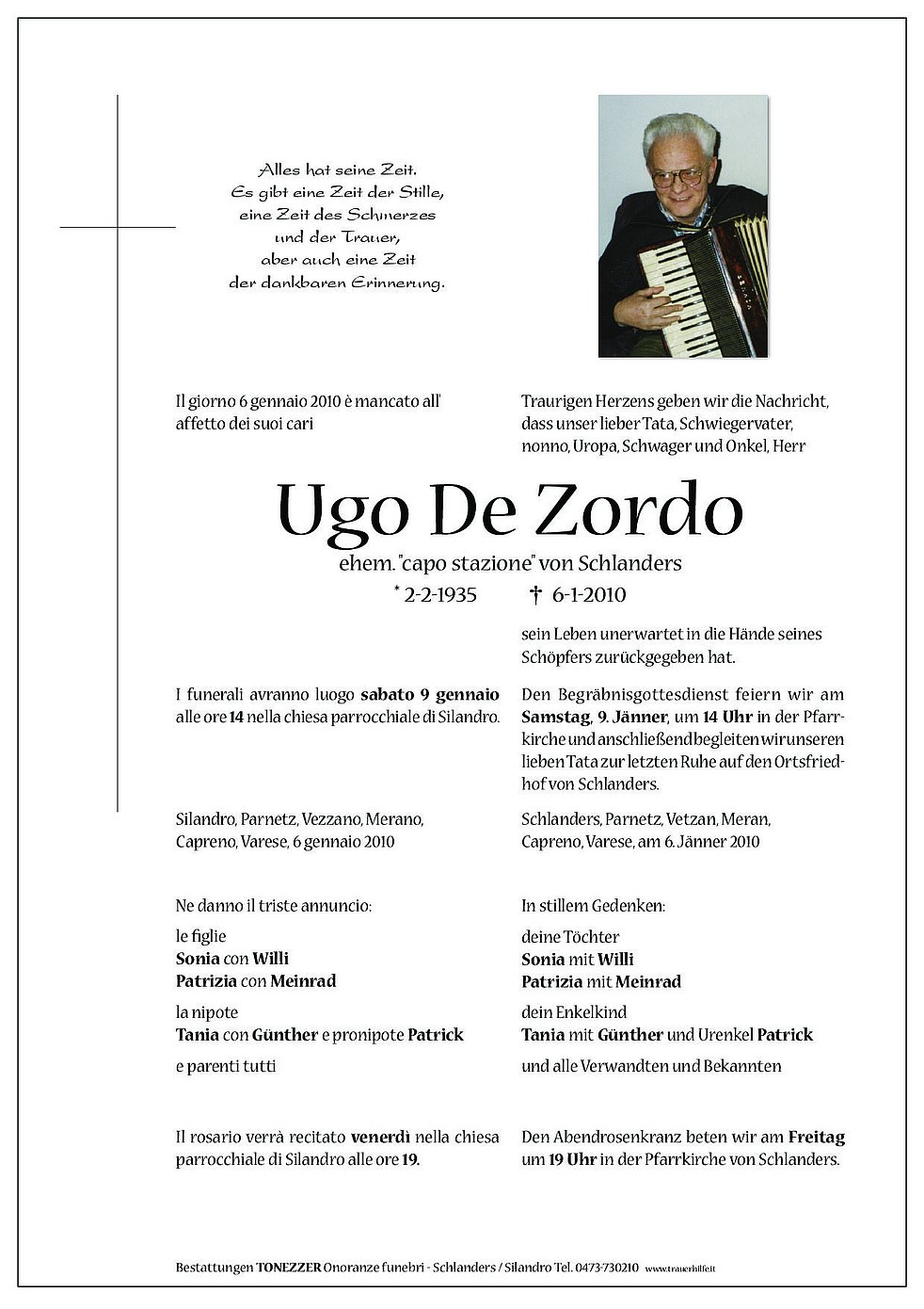 Den Begräbnisgottesdienst feiern wir am Samstag, 9. Jänner, um 14 Uhr in der Pfarrkirche und anschließend begleiten wir unseren lieben Tata zur letzten Ruhe auf den Ortsfriedhof von Schlanders.