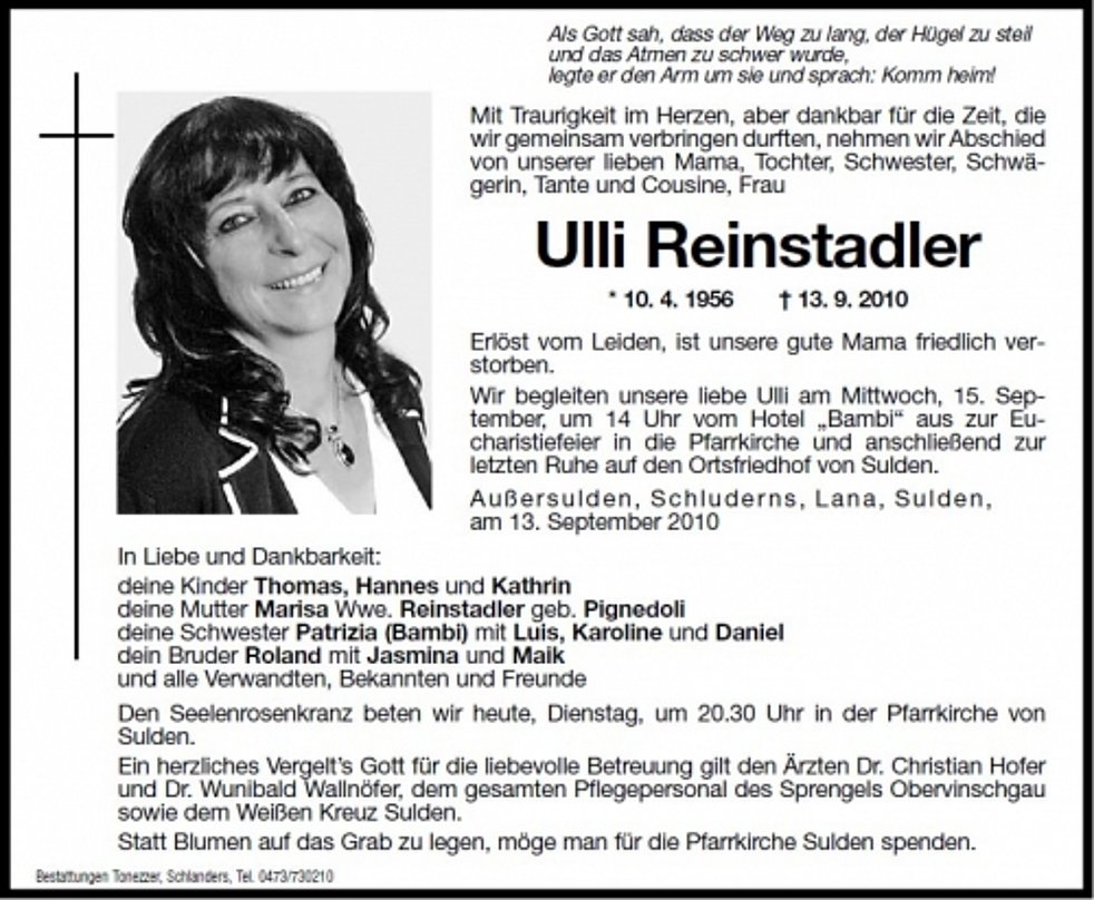 Wir begleiten unsere liebe Ulli am Mittwoch, 15. September, um 14 Uhr vom Hotel „Bambi“ aus zur Eucharistiefeier in die Pfarrkirche und anschließend zur letzten Ruhe auf den Ortsfriedhof von Sulden.