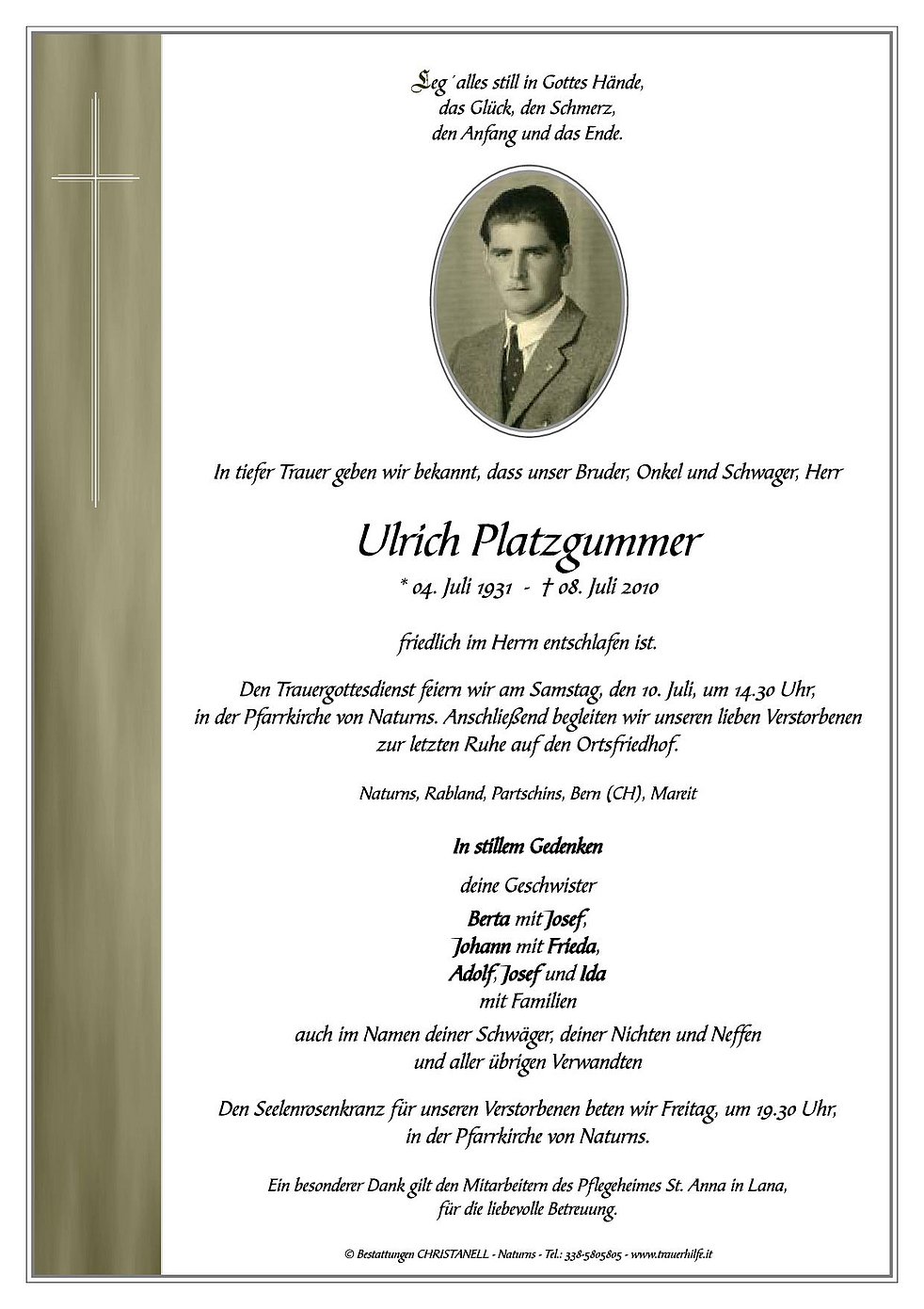 Den Trauergottesdienst feiern wir am Samstag, den 10. Juli, um 14.30 Uhr, in der Pfarrkirche von Naturns. Anschließend begleiten wir unseren lieben Verstorbenen zur letzten Ruhe auf den Ortsfriedhof.