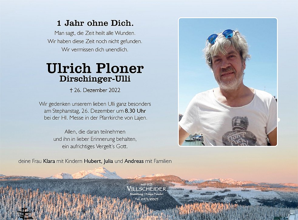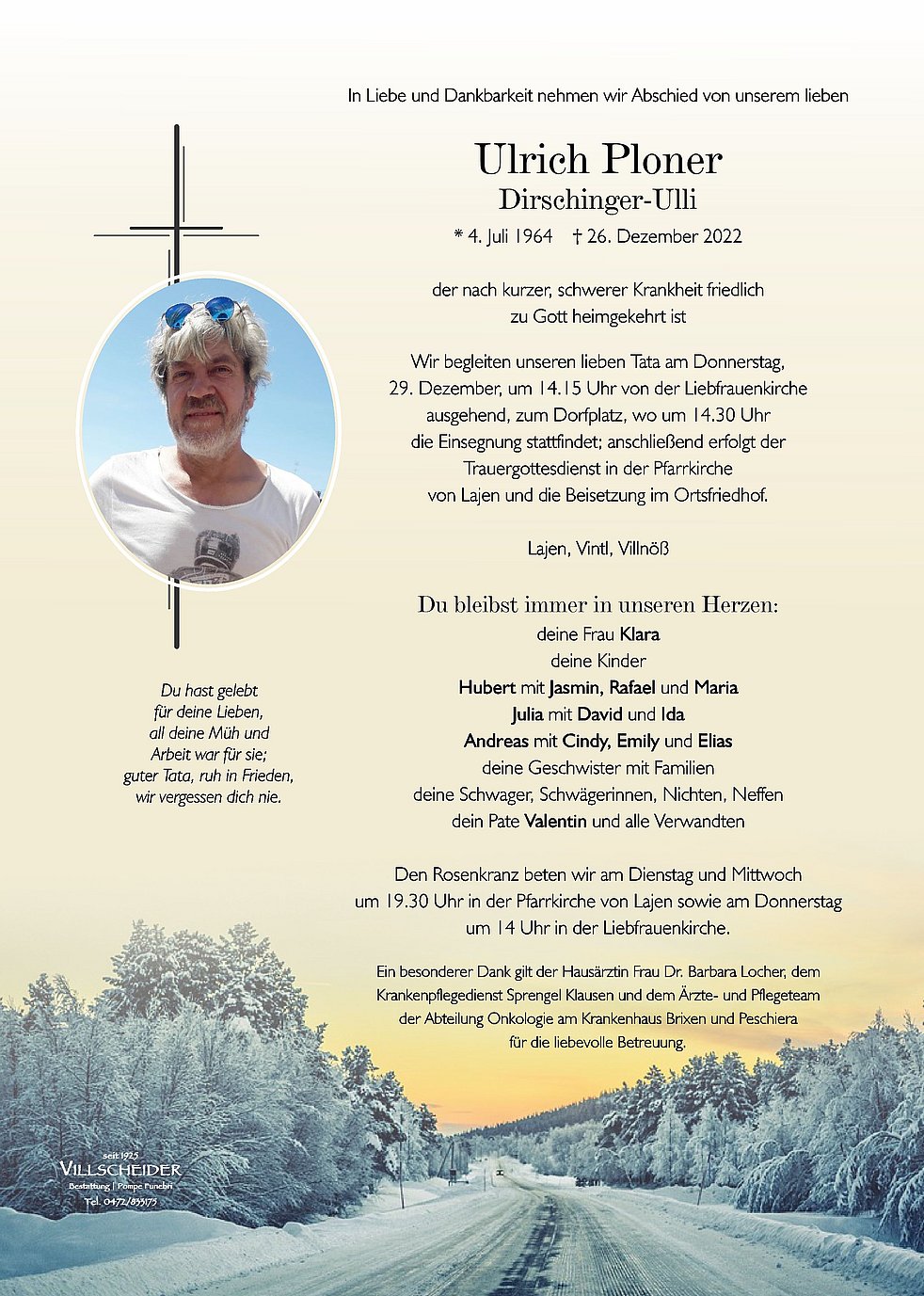 Lieber Uli, unsere Wege kreuzten sich 2021 im KH Brixen Abt. Medizin! Jeden Tag saßen wir auf dem Balkon und unterhielten uns, um a bissl die Zeit zu vertreiben. Besuch war ja leider (Corona) nicht gestattet! Viel hast du mir über dein Arbeitsleben, dein Betrieb und was Du in deiner Pension alles noch machen möchtest. Du warst voller Tatendrang und keine Spur von Trübsal. Auch bei unsern letzten Treffen bei einer unseren Kontrollen im KH warst Du voller Hoffnung. Ruhe nun in Frieden und schau auf deine Lieben, schade das wir uns nicht mehr wiedersehen!