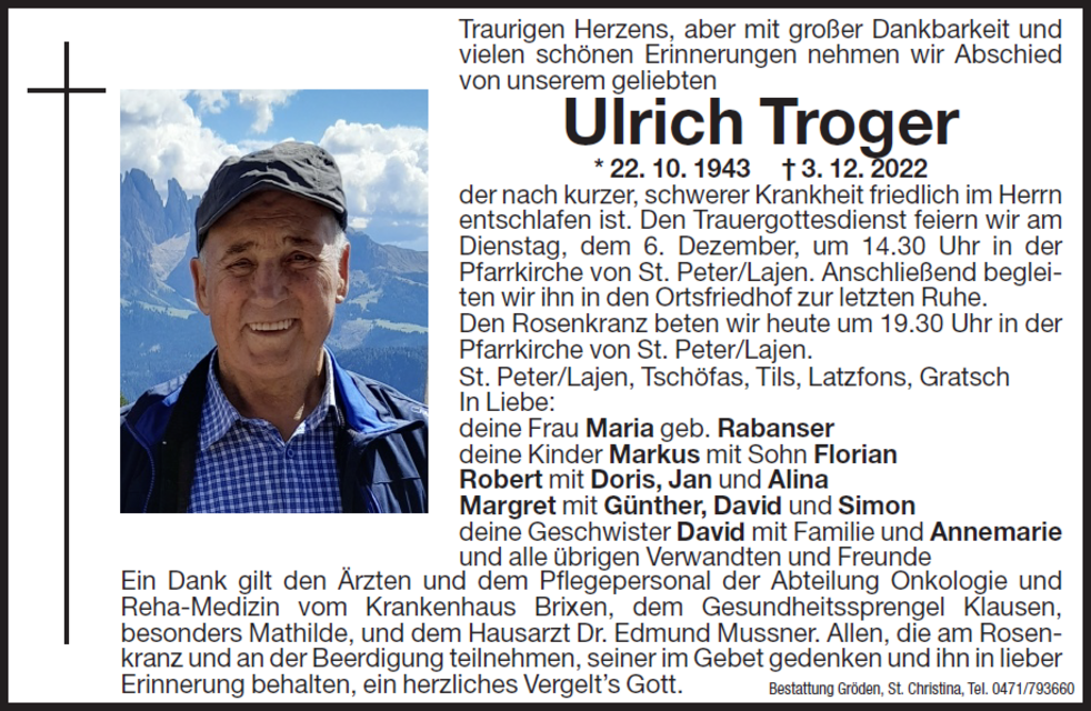 Den Trauergottesdienst feiern wir am Dienstag, dem 06. Dezember, um 14.30 Uhr in der Pfarrkirche von St. Peter/Lajen. Anschließend begleiten wir ihn in den Ortsfriedhof zur letzten Ruhe.