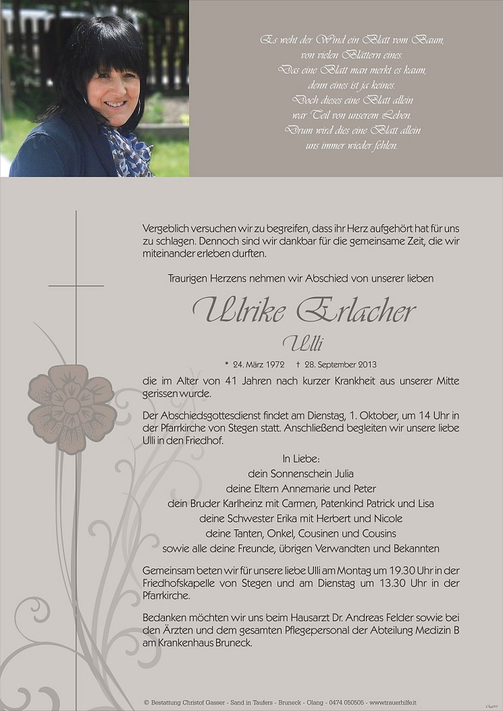 Der Abschiedsgottesdienst findet am Dienstag, 1. Oktober, um 14 Uhr in der Pfarrkirche von Stegen statt. Anschließend begleiten wir unsere liebe Ulli in den Friedhof.