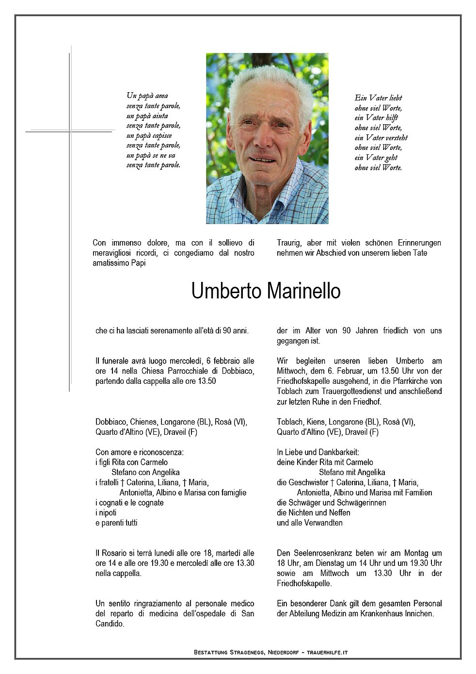 Wir begleiten unseren lieben Umberto am Mittwoch, dem 6. Februar, um 13.50 Uhr von der Friedhofskapelle ausgehend, in die Pfarrkirche von Toblach zum Trauergottesdienst und anschließend zur letzten Ruhe in den Friedhof.