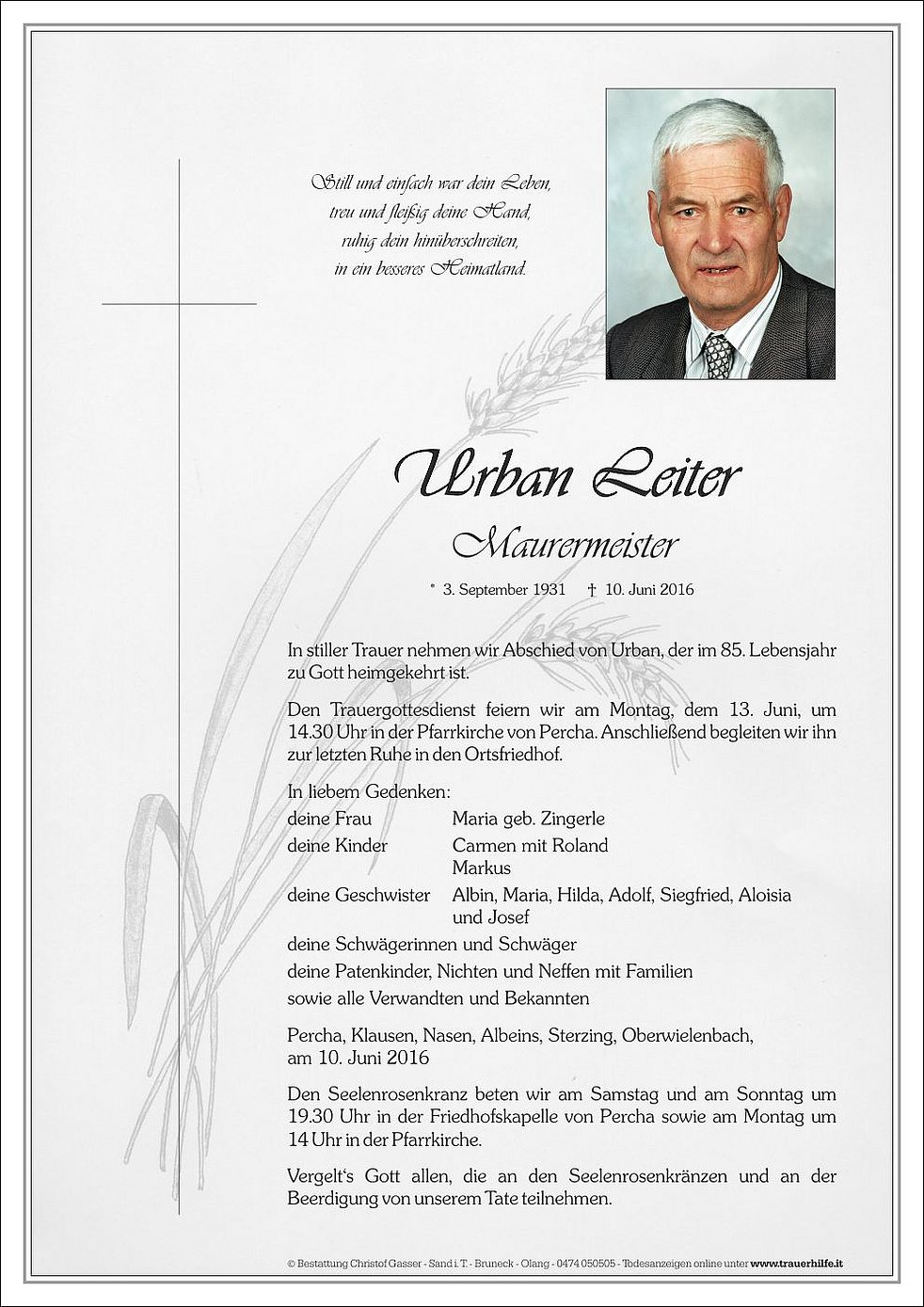 In stiller Trauer nehmen wir Abschied von Urban, der im 85. Lebensjahr zu Gott heimgekehrt ist.