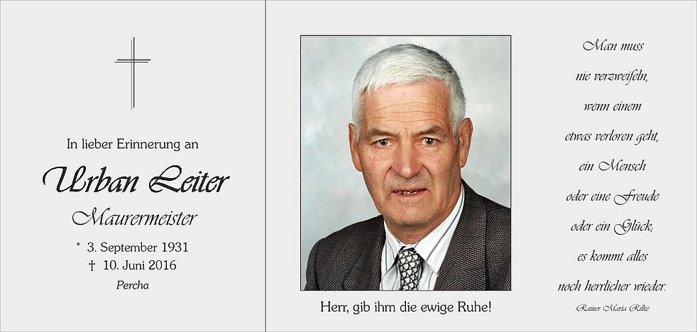 Den Trauergottesdienst feiern wir am Montag, dem 13. Juni, um 14.30 Uhr in der Pfarrkirche von Percha. Anschließend begleiten wir ihn zur letzten Ruhe in den Ortsfriedhof.