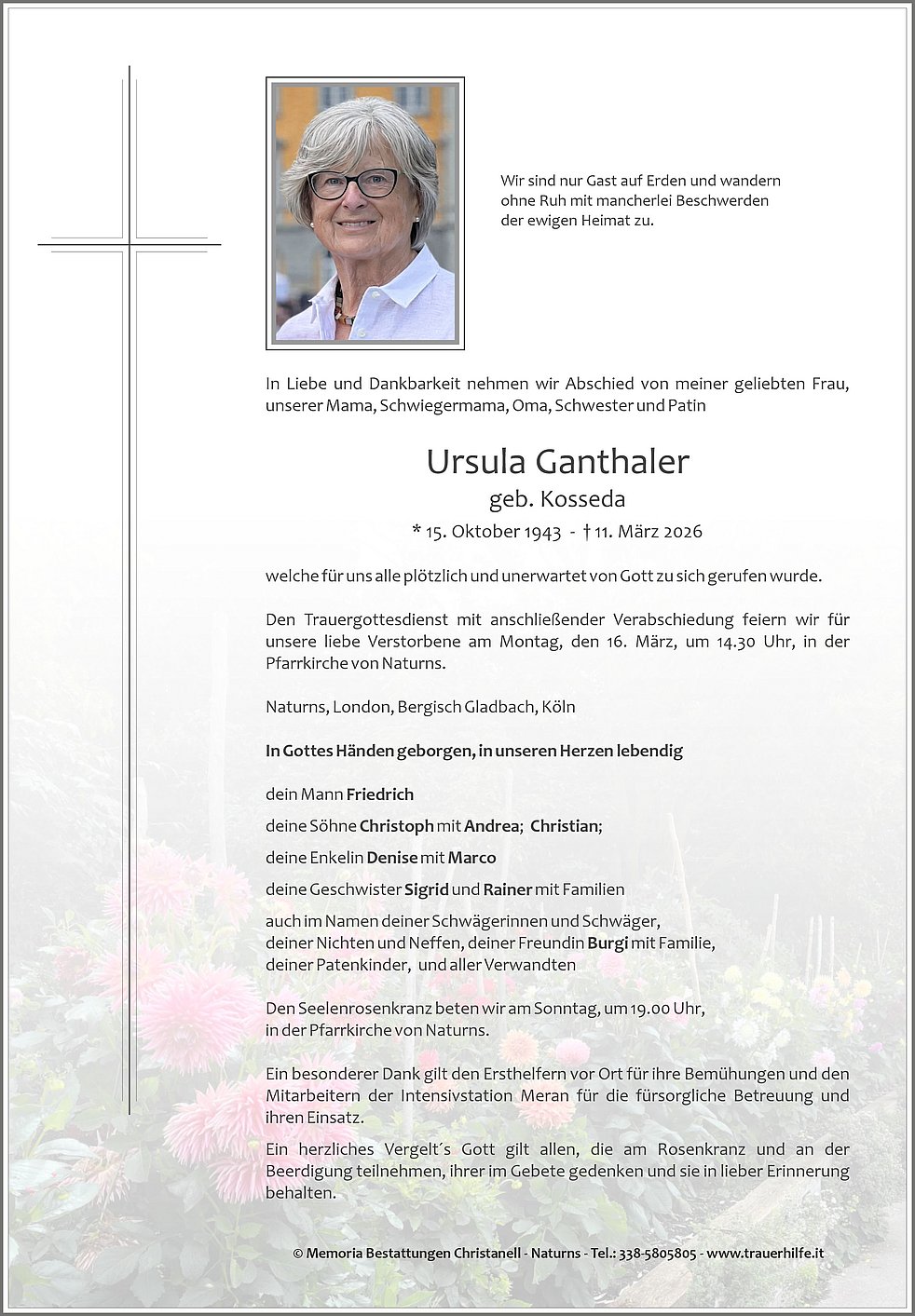 Den Trauergottesdienst mit anschließender Verabschiedung feiern wir für unsere liebe Verstorbene am Montag, den 16. März, um 14.30 Uhr, in der Pfarrkirche von Naturns.