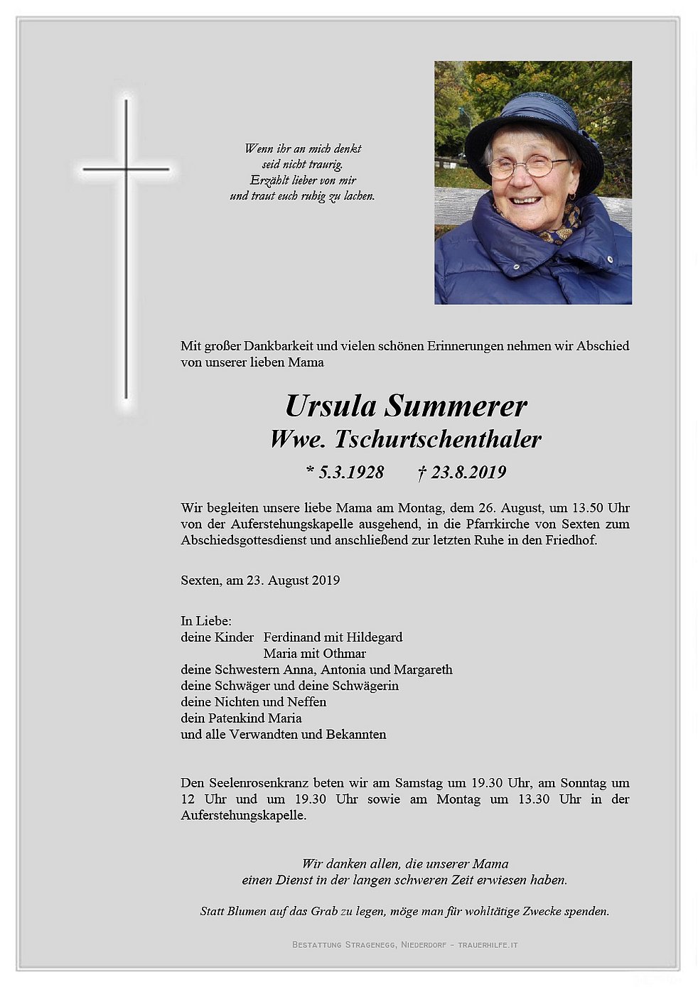 Wir begleiten unsere liebe Mama am Montag, dem 26. August, um 13.50 Uhr von der Auferstehungskapelle ausgehend, in die Pfarrkirche von Sexten zum Abschiedsgottesdienst und anschließend zur letzten Ruhe in den Friedhof.