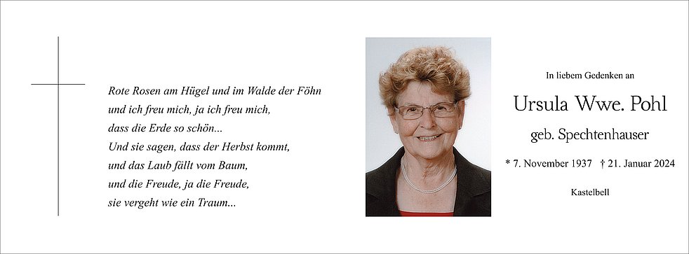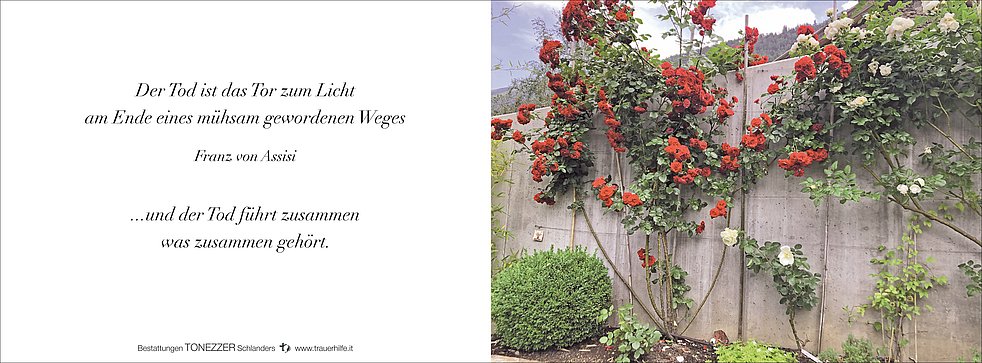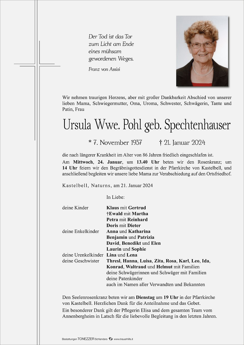 Am Mittwoch, 24. Januar, um 13.40 Uhr beten wir den Rosenkranz; um 14 Uhr feiern wir den Begräbnisgottesdienst in der Pfarrkirche von Kastelbell, und anschließend begleiten wir unsere liebe Mama zur Verabschiedung auf den Ortsfriedhof.